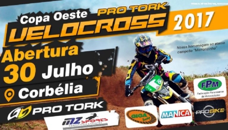 A abertura da Copa Oeste Pro Tork de Velocross 2017 será realizada neste fim de semana, dias 29 e 30 de julho, no Centro de Eventos da cidade de Corbélia (PR). Mais de 200 pilotos devem alinhar no gate para a disputa de 16 categorias. No sábado, acontecem os treinos livres. Já no domingo, os pilotos retornam a pista para o warm up e logo em seguida para as corridas. Quem for da região não pode perder, a entrada é franca.