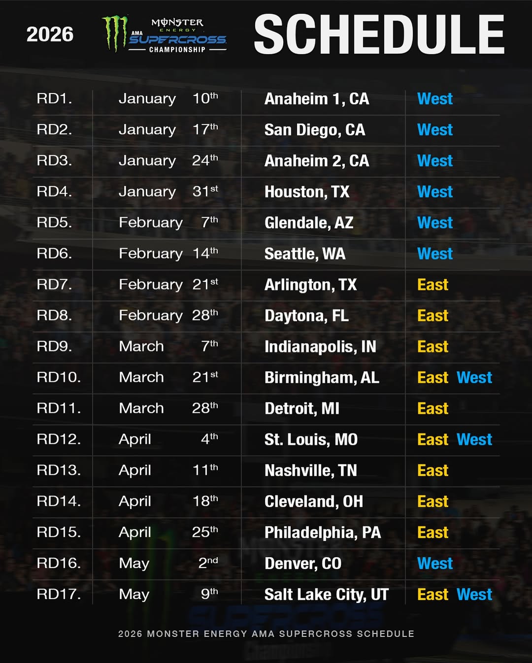 A SMX League™ anunciou hoje a programação completa da temporada do Monster Energy SMX World, Monster Energy AMA Supercross Championship e Pro Motocross de 2026.