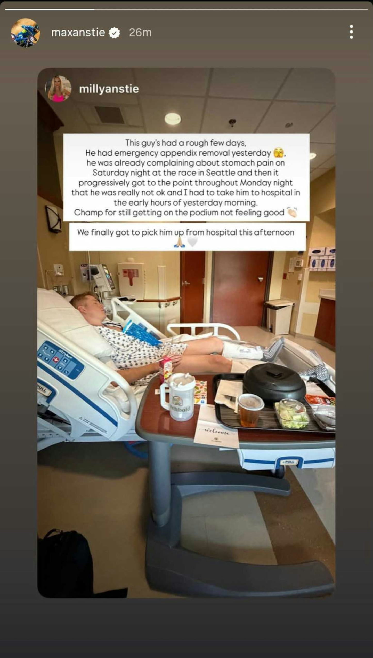 Ele teve uma remoção de emergência do apêndice ontem 🫣, ele já estava reclamando de dor de estômago no sábado à noite na corrida em Seattle e, em seguida, chegou progressivamente ao ponto durante a noite de segunda-feira que ele realmente não estava bem e eu tive que levá-lo ao hospital nas primeiras horas de ontem de manhã.Campeão por ainda subir no pódio não se sentir bem 👏🏻
