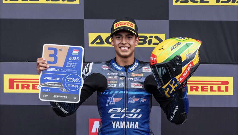 O piloto peruano-brasileiro Aymon Bocanegra, da equipe Yamaha AD78 FIM América Latina, voltou a subir no pódio do Mundial Yamaha R3 BLU CRU neste domingo (27). Bocanegra conquistou o terceiro lugar na Corrida 2 da quarta etapa da competição, realizada no circuito Balaton Park, na Hungria.