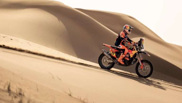 O palco foi extremamente rápido hoje com uma navegação mais fácil, o que tornou muito difícil compensar o tempo com os pilotos na frente. Começando do quarto, qualquer pequeno erro significava que não havia chance de fechar a lacuna, a menos que os líderes cometessem um erro. O vento estava forte no final, empurrando a moto e dificultando o alcance da velocidade máxima, com poeira e areia atingindo nossos rostos e reduzindo a visibilidade. As coisas estão muito mais próximas na frente agora, mas ainda assim, estou feliz por chegar a outro final de estágio, e agora podemos nos reagrupar e nos preparar para os últimos dias. – Daniel Sanders