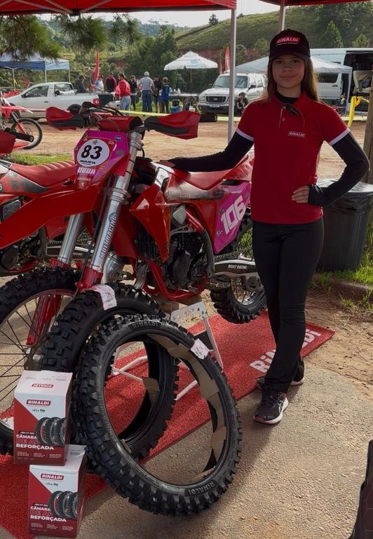 Na categoria feminina a Rinaldi também está bem representada. A paulista Eduarda Campos, mais conhecida como Duda, passa a defender a marca a partir da etapa de Castro Alves. Aos 14 anos, a piloto de Mairiporã (SP) começou a fazer trilha aos 6 anos com os pais, ambos são pilotos e também competem. Entre os títulos é bicampeã brasileira de Enduro (categoria Kids feminina 2024/ 2025), campeã paulista (categoria feminina 2025) e campeã paulista de Sprint Enduro (categoria feminina 2025).