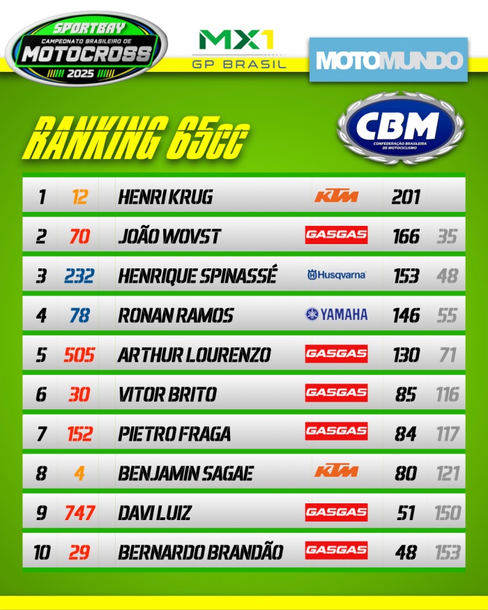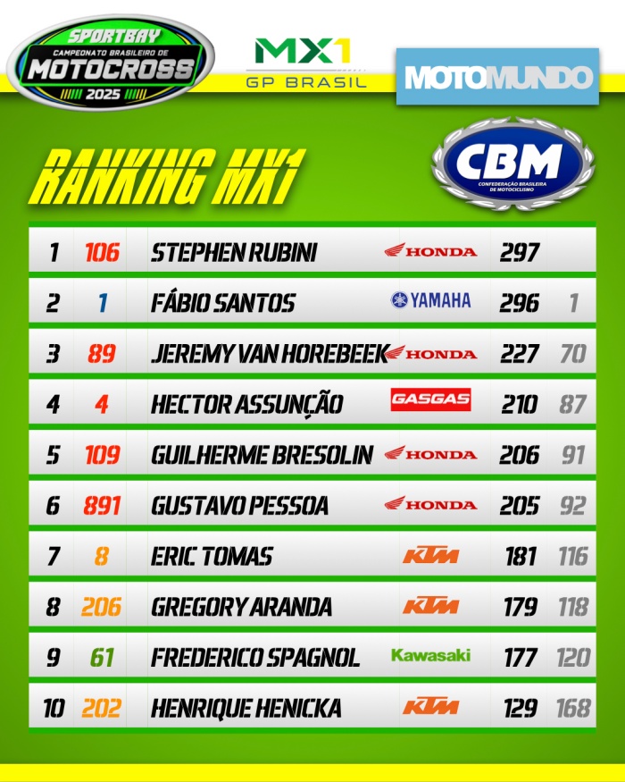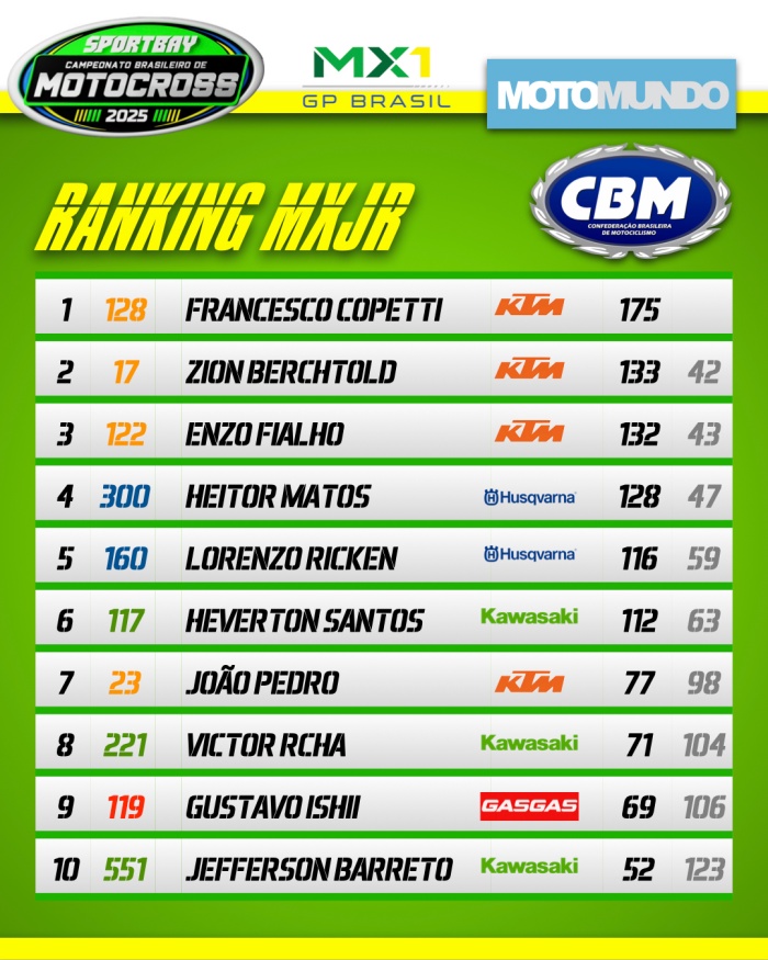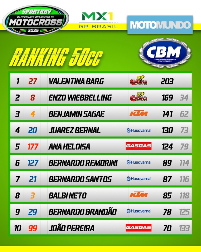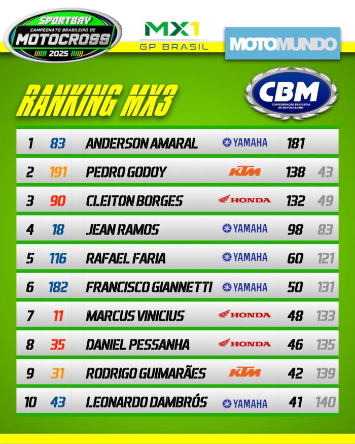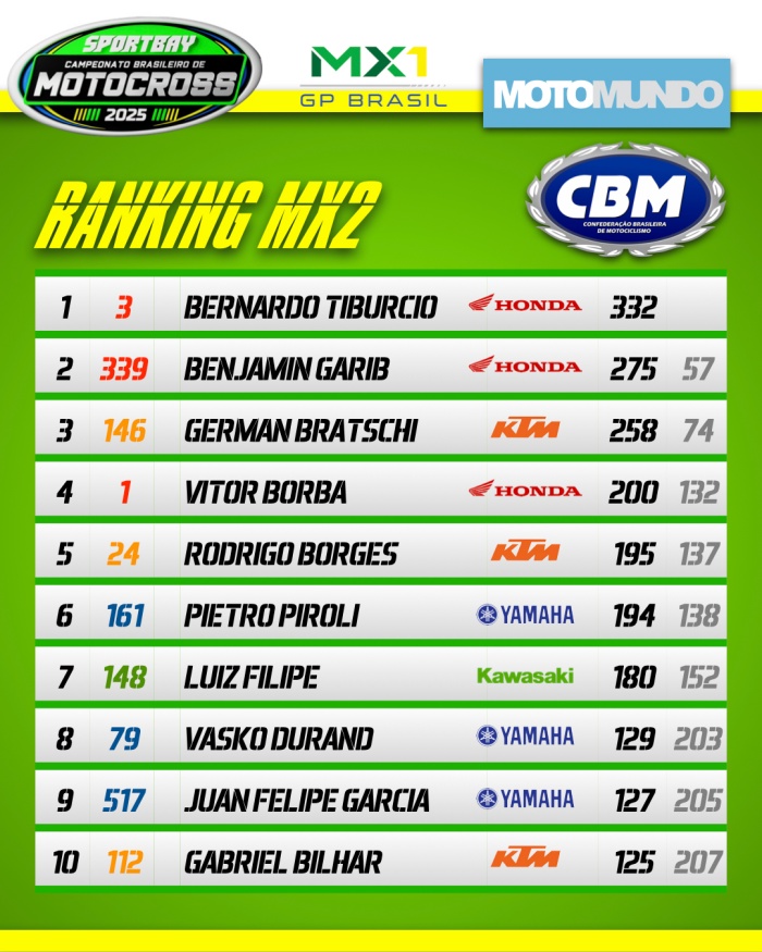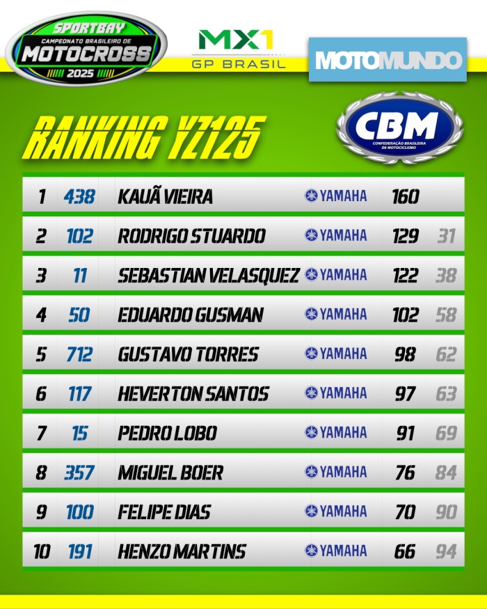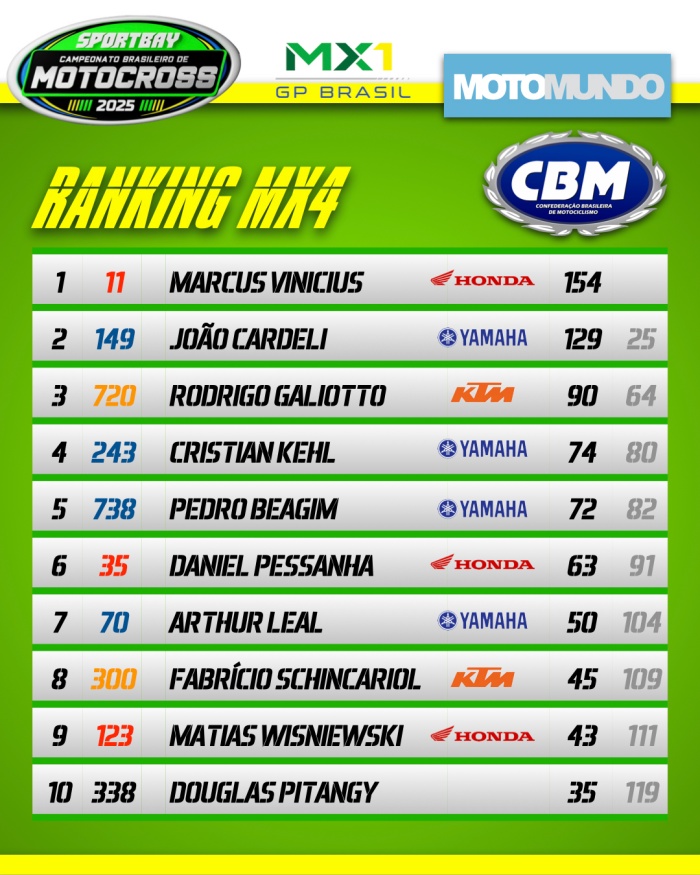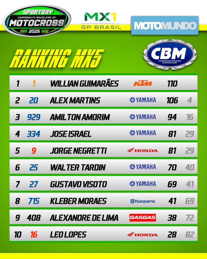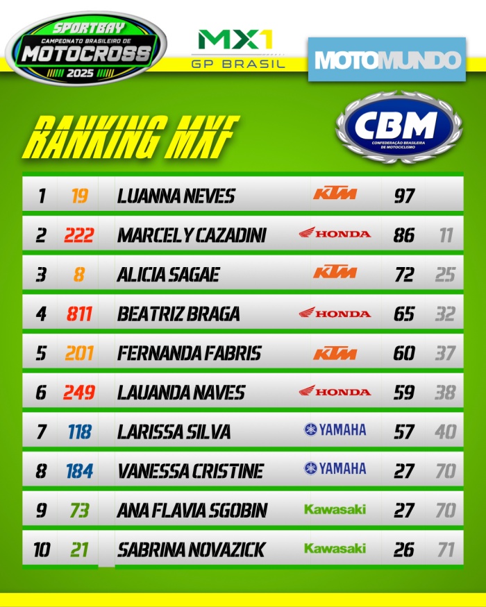 Após sete etapas realizadas, segue abaixo o ranking acumulado das categorias MX1, MX2, MX3, MX4, MX5, MX2JR, MXJR, YZ125, FEMININA, 65cc e 50cc