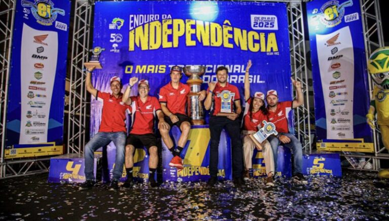 Bruno Crivilin e a equipe Honda Racing venceram pelo segundo ano consecutivo a mais tradicional prova do motociclismo off-road brasileiro. Neste domingo (7/9), em Carmo da Mata, Minas Gerais, o capixaba assegurou a conquista do Enduro da Independência na categoria Elite, a principal da competição de regularidade, para inscrever mais uma vez seu nome no troféu permanente que reúne os campeões das 43 edições. O roteiro de 2025 incluiu cerca 776 quilômetros em quatro dias de disputas, largando de Aparecida (SP).