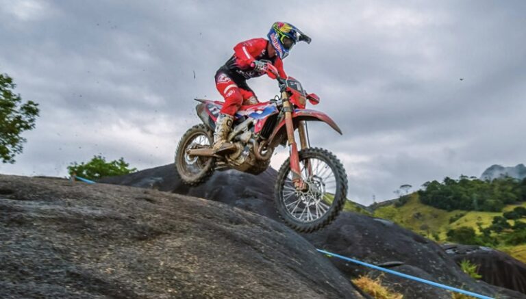 Competindo em casa, na cidade de Aracruz (ES), Bruno Crivilin fez a festa da torcida e venceu a quinta prova do Campeonato Brasileiro de Enduro 2023, realizada neste final de semana (22 e 23/7). O piloto da equipe Honda Racing competiu como convidado e foi o mais rápido na Elite (geral) e na categoria E1, com a motocicleta CRF 250RX.