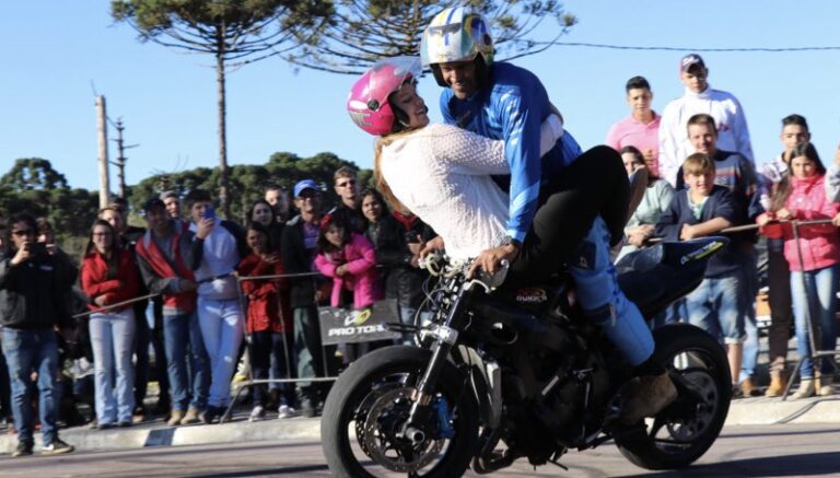 Espetáculo de manobras radicais com motos é uma das atrações do Encontro de Motociclistas Motorock