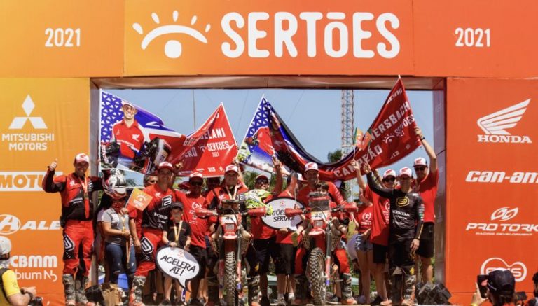 Os campeões da equipe Honda Racing cruzaram a rampa de chegada do Sertões 2021 neste domingo (22/8), em Tamandaré (PE), após aproximadamente 3.600 km percorridos – mais de 2.000 deles de trechos cronometrados. A largada da prova foi no último sábado (14/8), na Praia da Pipa, em Tibau do Sul (RN). A equipe comemorou o bicampeonato de Bissinho Zavatti na categoria Moto 2, com a CRF 450RX. Já a classe Brasil, direcionada a motos nacionais, teve um campeão inédito, o estreante Tiago Wernerbach, com a CRF 250F.