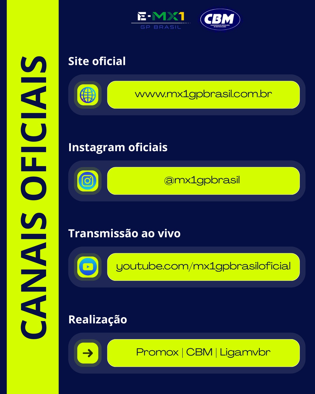 O E-MX1 GP Brasil é uma realização da Promox, com chancela da Confederação Brasileira de Motociclismo (CBM) e desenvolvimento pela Liga MVBR, reforçando a credibilidade e o compromisso com o desenvolvimento do esporte — dentro e fora das pistas.