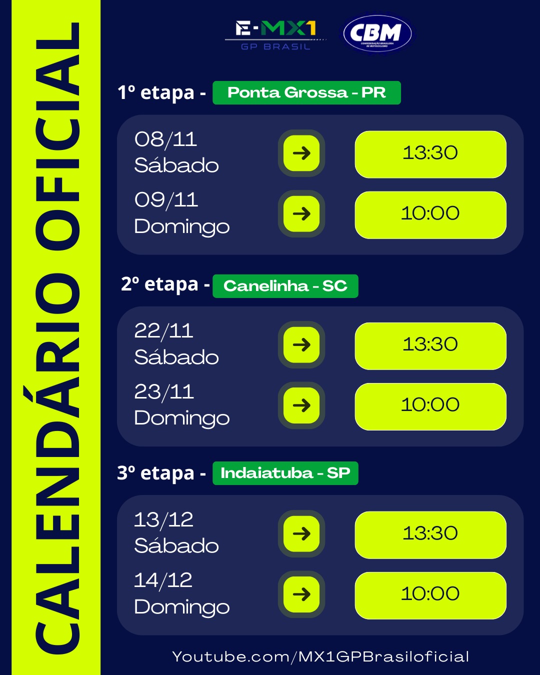 Os treinos oficiais acontecem sempre aos sábados, enquanto as corridas válidas pelo campeonato são realizadas no domingo. Todas as etapas terão transmissão ao vivo pelo YouTube oficial do MX1 GP Brasil (https://www.youtube.com/@MX1GPBrasiloficial), permitindo que o público acompanhe cada manobra, disputa e vitória direto de casa.