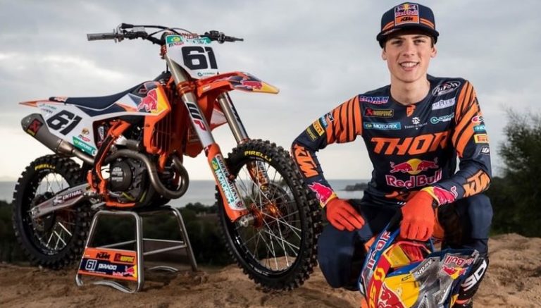 “Bem sucedida a cirurgia na clavícula direita de @jorgeprado61. O bicampeão mundial de MX2 passou por uma operação na terça-feira, após sofrer uma fratura na clavícula direita durante um acidente de treino na Bélgica. Agora, o número 61 está se recuperando e deve estar novamente com sua #KTM 450 SX-F dentro de quatro semanas. O MXGP 2020 não está programado para reiniciar em agosto.”
