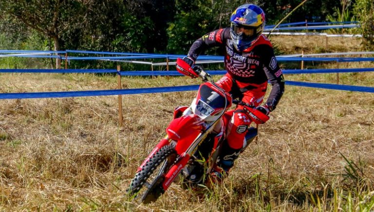 Calor, terreno seco, poeira e muita trilha. Assim pode ser definida a quinta etapa do Campeonato Brasileiro de Enduro FIM para motocicletas, realizada em Marzagão (GO), neste final de semana (29 e 30 de junho). A prova marcou a terceira vitória consecutiva do capixaba Bruno Crivilin, da equipe Honda Racing, nas categorias E1 e Enduro GP – direcionada aos mais rápidos da competição. O desafio serviu ainda para coroar mais uma vitória de Bárbara Neves pela categoria Feminina, deixando a goiana muito perto de comemorar o segundo título brasileiro da carreira.