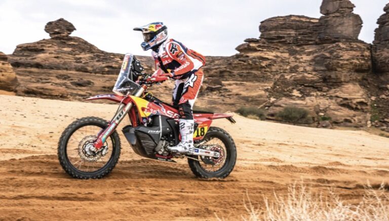 Daniel Sanders levou sua GASGAS a uma vitória com uma margem cinco minutos em um longo dia no deserto da Arábia Saudita e passa a ser o novo líder da prova. Ricky Brabec da Honda, caiu e esta fora do Dakar.