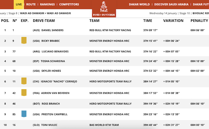 Como resultado, o piloto australiano da KTM recuperou a liderança na classificação geral, onde agora tem uma vantagem de 6’24” sobre seu rival americano, Ricky Brabec.