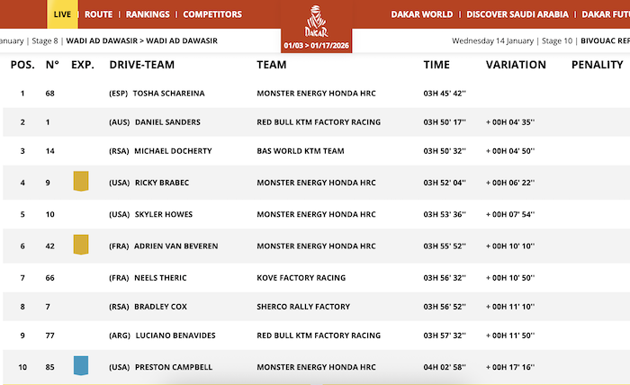 O grande golpe de hoje foi desferido por Tosha Schareina, que foi o mais inteligente no início da especial, escolhendo o cânion certo em um ponto onde seus rivais optaram pela opção errada, e foi especialmente rápido no final da etapa, que completou com o melhor tempo: 6’24” mais rápido que Daniel Sanders e 6’22” à frente de seu companheiro de equipe da Honda, Ricky Brabec.