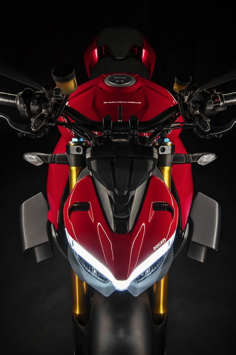 Uma Panigale V4 despojada das carenagens, com guidão alto e largo, peso de 178 kg, motor Desmosedici Stradale de 1.100 cm3 com 208 cv, mantido à distância por duas asas laterais de cada lado e um pacote eletrônico de última geração: é a “Streetfighter”, ou a fórmula que dá vida à Streetfighter V4.