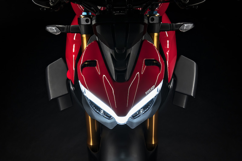 O espírito da Streetfighter V4 é perfeitamente representado pelo design minimalista do farol full-LED que lembra a frente da Panigale V4 e remete à expressão do Joker, o personagem Coringa dos quadrinhos, que inspirou o designer da nova naked. A assinatura da Ducati é então representada pelo DRL em forma de V que já caracteriza a Panigale V4 e a SuperSport.