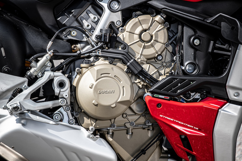 A nova Streetfighter V4 está equipada com o Desmosedici Stradale de 1.103 cm3. Nessa configuração, o V4 90 ° entrega 208 cv a 13.000 rpm, potência elevada para uma naked, inigualável no segmento, consistente com a imagem exagerada da nova Streetfighter V4. O valor de torque máximo de 123 Nm (12,5 kgm) a 9.500 rpm é praticamente inalterado em comparação com a Panigale V4. Um mapa dedicado de controle do motor permite que você explore com segurança o desempenho da Streetfighter V4 quando usado na estrada.