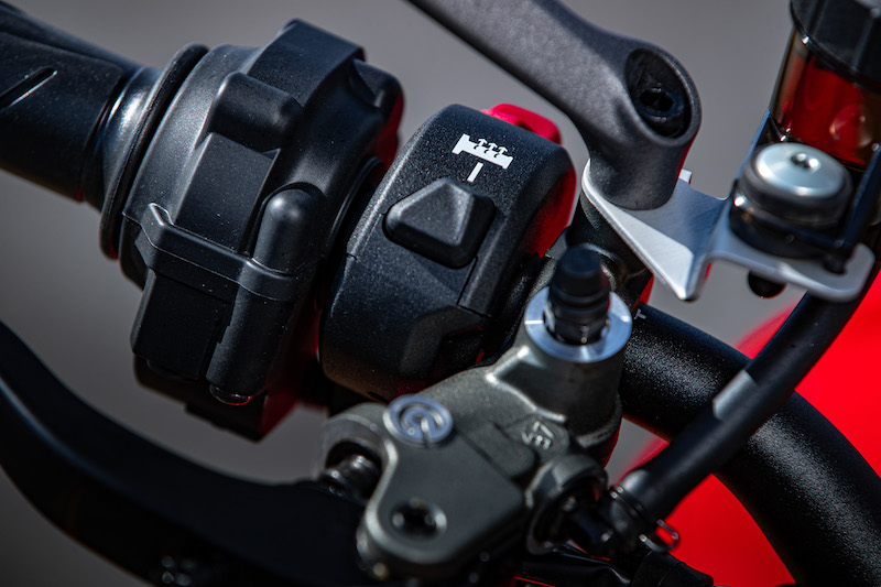 A nova estratégia Ducati Traction Control (DTC) EVO 2 deriva da Ducati Desmosedici GP18 e já é usada na Panigale V4 R e V4 R SBK. Além de fazer interface com a Unidade de Medição Inercial de 6 eixos (IMU) e adaptar a intervenção e o escorregamento ao ângulo de inclinação da moto, o software melhora significativamente a gestão da potência fora das curvas graças à nova estratégia de controle “preditiva”. Por atuar não só no valor instantâneo do giro traseiro, mas também na sua variação, intercepta a perda de aderência mais rapidamente e reduz os picos de escorregamento, garantindo assim uma intervenção mais rápida e regular. Tudo isso se traduz em maior estabilidade do veículo ao sair das curvas, mesmo em condições de aderência não ideais, maior aceleração e desempenho aprimorado tanto na única volta quanto em corridas longas.