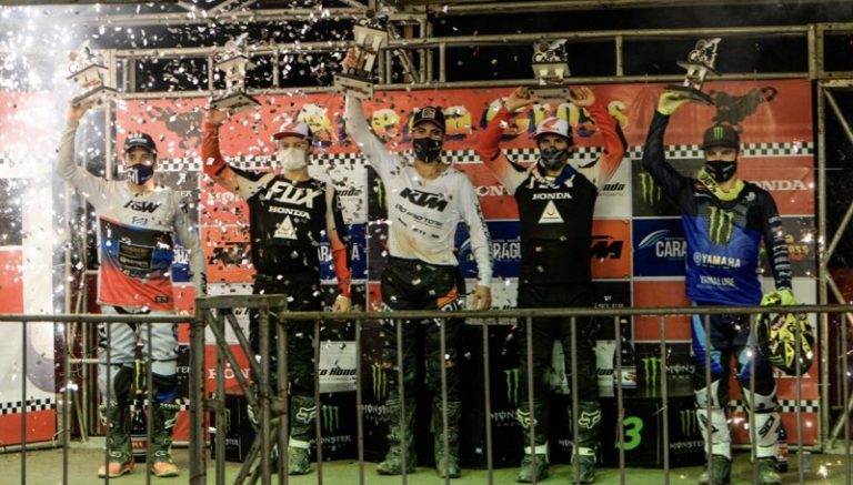 A HUSQVARNA POWER HUSKY/GOLDENTYRE conquistou três pódios na abertura da temporada 2021 do Arena Cross, na noite de sábado (25), em Caraguatatuba, no litoral norte paulista. Humberto “Machito” Martin #101 (FC 450 Rockstar) garantiu o 4º lugar no pódio da categoria principal, a Pró, após ficar em 2º na Corrida 2 – largou na frente e liderou até a metade da corrida – e em 4º na Corrida 1. Já os pilotos satélites German Bratschi #146 (FC 250 Rockstar) terminou em 3º lugar na AX2 e Heitor Matos #300 (TC 50) venceu na 50cc e é líder da categoria. Essa foi a estreia do time da Husqvarna no evento que chega a 23ª edição.