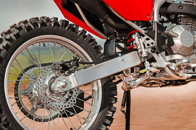 A adoção de aletas laterais ao tanque com novo desenho, que visou abrigar o radiador de óleo e também aproximar o design da off-road Made in Manaus ao das CRF importadas, é destaque. Outra inovação de caráter prático/estético vem das laterais, agora fixadas por meio de parafusos.