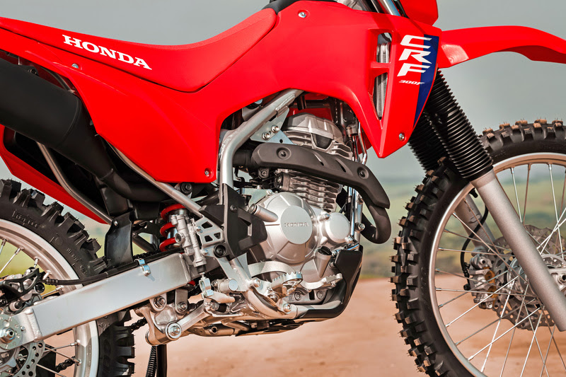 Importante passo à frente na CRF 300F é o novo motor, um monocilíndrico OHC arrefecido a ar, de 293,5 cm3, que estreou equipando a CB 300F Twister em 2023 e, na sequência, ganhou versões ajustadas para equipar a XRE 300 Sahara, lançada no final de 2024 e a XR 300L Tornado, em 2025.