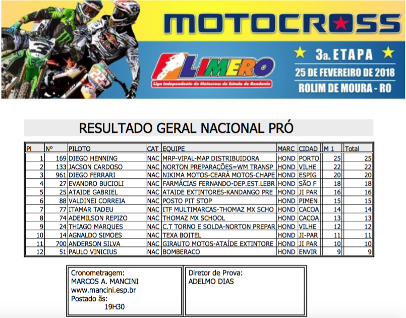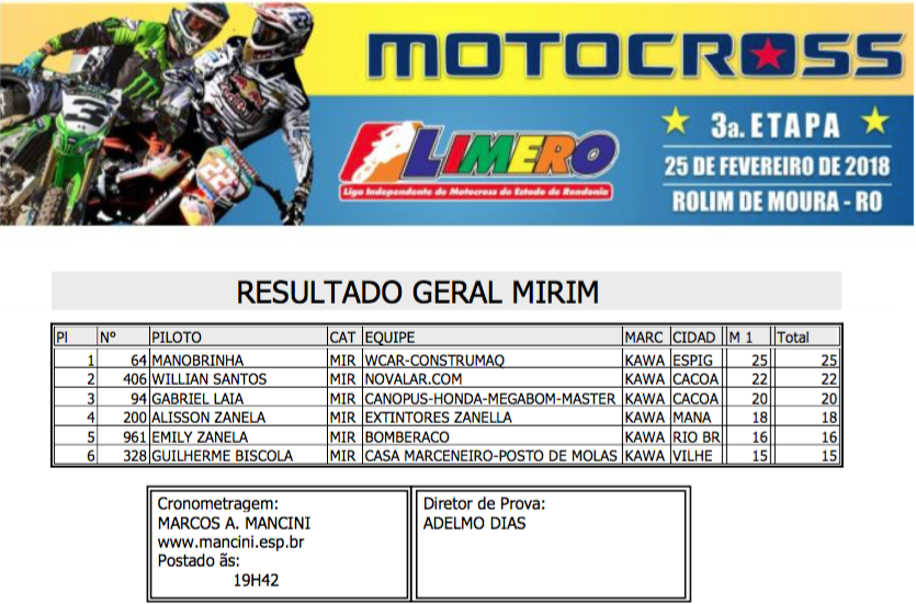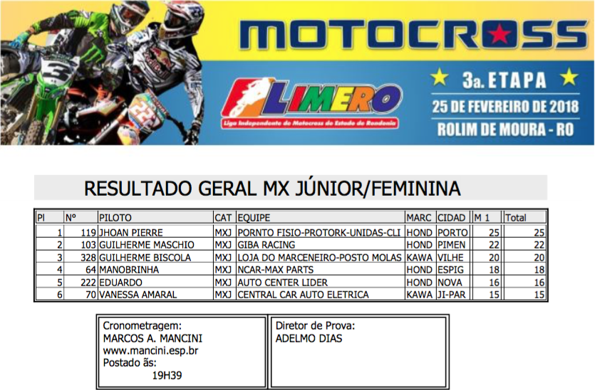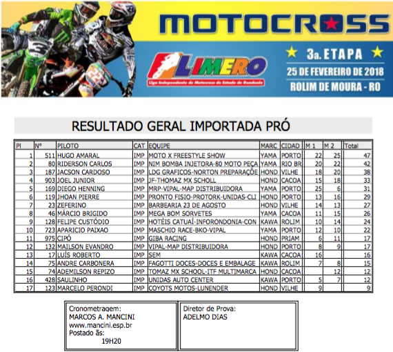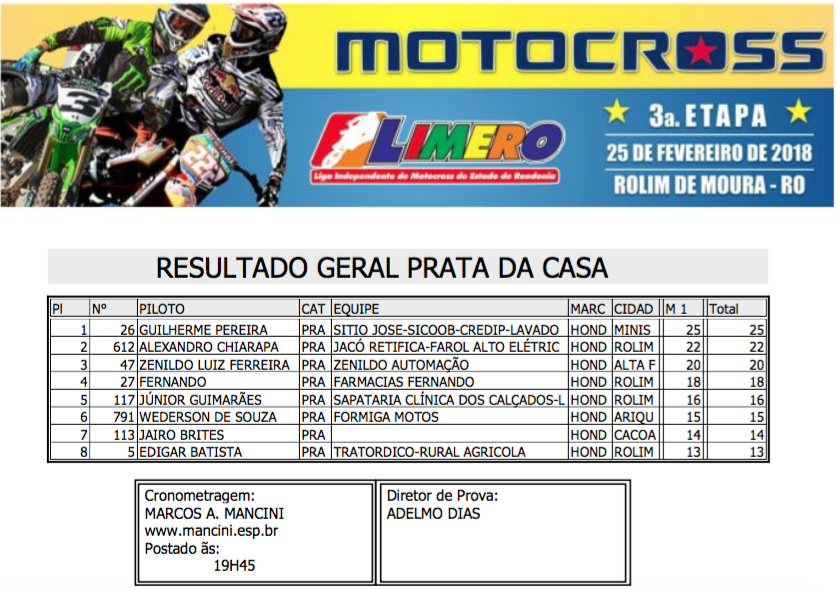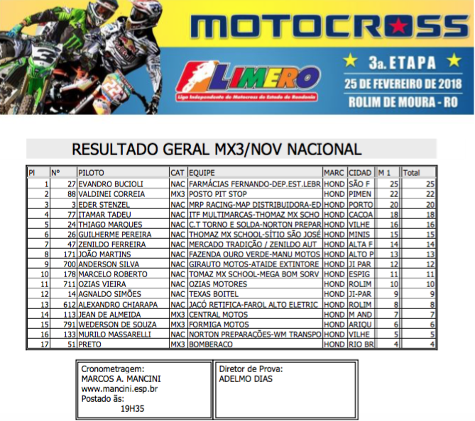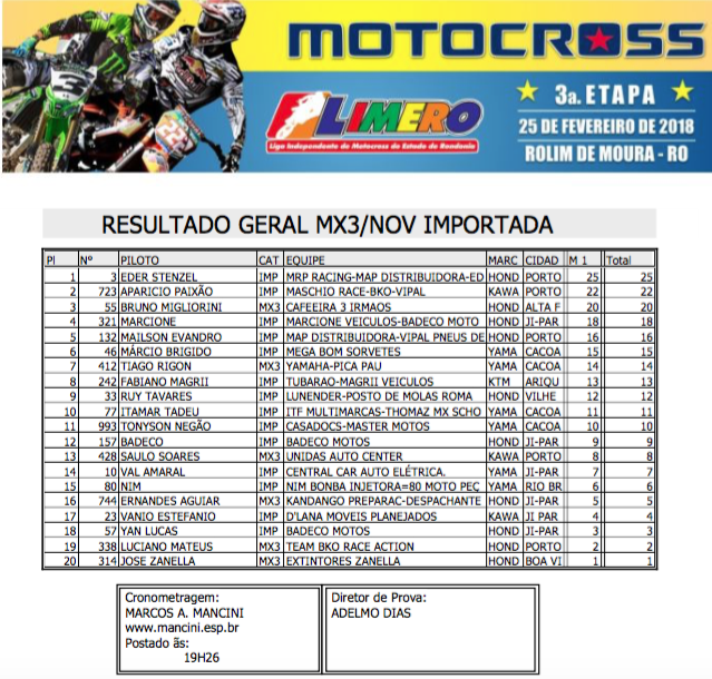 Contando com a presença dos principais pilotos de Rondônia, além de representantes dos estados do Acre, Amazonas e do Peru a pista do Balneário Muynicipal de Rolim de Moura foi palco do fim de semana de uma grande show de velocidade, adrenalina e emoções com a realização da terceira etapa do Campeonato Estadual Limero de Motocros 2017/2018.