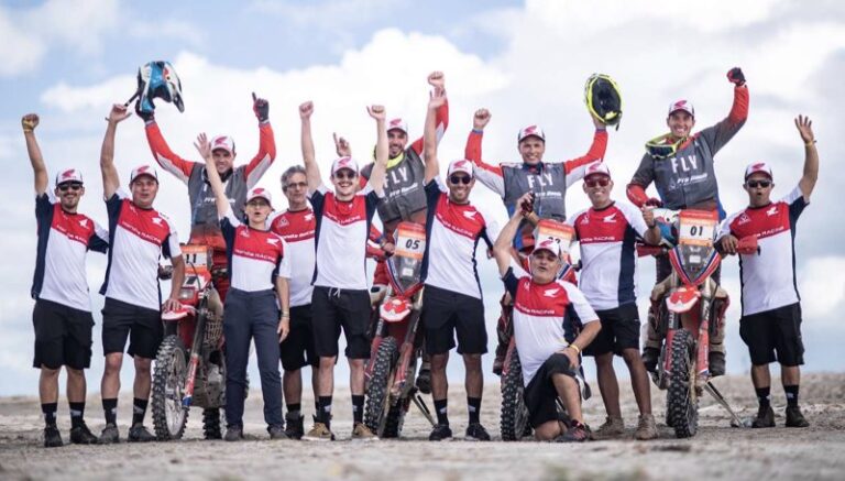 Após cerca de 3.800 quilômetros percorridos em oito etapas, a Honda Racing chegou completa neste sábado (19/8) na Praia do Preá, em Cruz (CE), local de encerramento do Sertões 2023. A equipe que mais venceu entre as motos, com 10 títulos na classificação geral da prova, emplacou três pilotos no Top 5 acelerando a Honda CRF 450RX: Martin Duplessis (3º colocado), Gabriel Soares (4º) e Bissinho Zavatti (5º). Outro destaque da Honda Racing foi o piloto Tiago Wernersbach, que comemorou o tricampeonato da categoria Brasil com a CRF 250F.