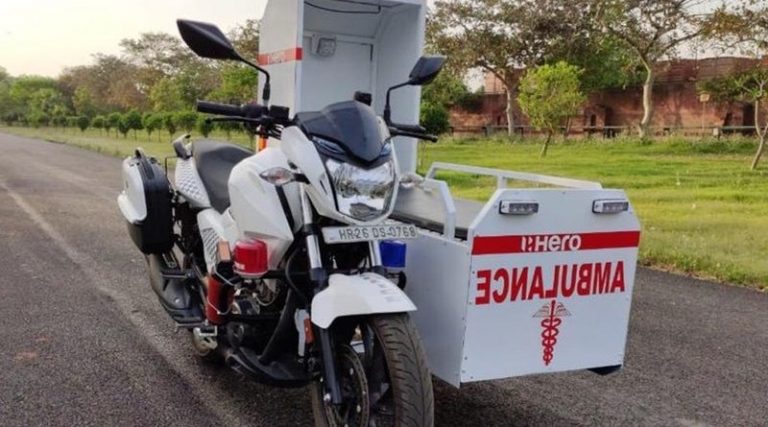 A ‘motolância’ foi desenvolvida pela fabricante de motos indiana Hero, e 60 delas doadas para autoridades locais. O modelo usa como base motos de 150 cc e foram produzidas artesanalmente pela empresa, que adaptou um ‘side car’ na lateral do veículo para levar os doentes de Covid-19.
