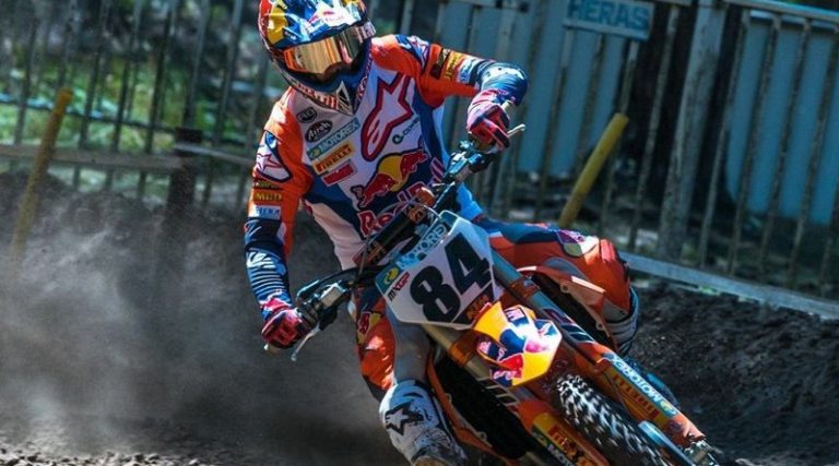 Jeffrey Herlings quebrou o tornozelo após o acidente na volta de apresentação da primeira bateria na Letônia. Surpreendentemente, o campeão enfrentou a dor e ganhou a primeira corrida depois de uma batalha com Arnaud Tonus.
