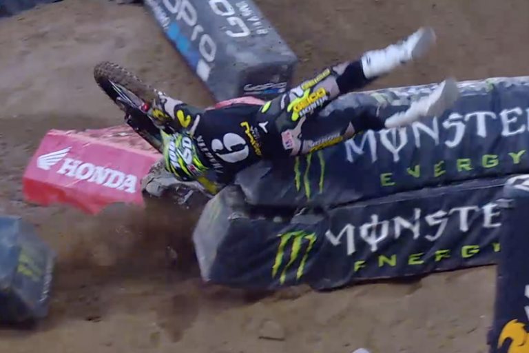 O piloto da GEICO Honda perdeu o controle quando chegou perto de um salto durante a qualificação no sábado, jogando-o sobre o guidão em uma queda violenta. Ele foi salvo de lesões graves por um par de “tuff blox”, que o jogou para outra seção da pista, e mesmo assim conseguiu ficar em pé.