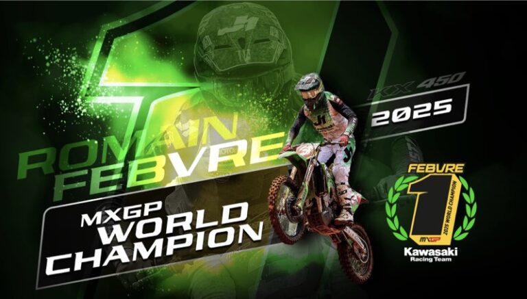 A Kawasaki Racing Team MXGP brilhou neste domingo com a conquista do título do Campeonato Mundial de Motocross FIM 2025 (MXGP) pelo piloto francês Romain Febvre. A decisão aconteceu no MXGP da Austrália apresentado pela Sitzler, realizado no Hidden Valley Motorsports Complex, em Darwin.