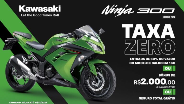 - Ninja 300 (modelo 2024): Financiamento com taxa 0%, seguro completo Bradesco ou bônus de R$2.000,00 para pagamento à vista.