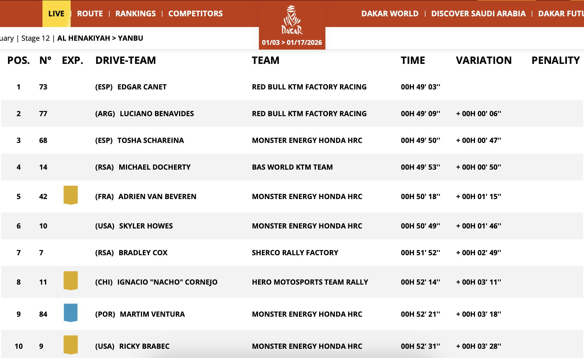 No início da manhã, foi um momento difícil para muitos dos principais pilotos. Aqui está o que aconteceu na última hora. Edgar Canet, que começou 31 minutos depois de Ricky Brabec, venceu a etapa por 6 segundos sobre seu companheiro de equipe Luciano Benavides!