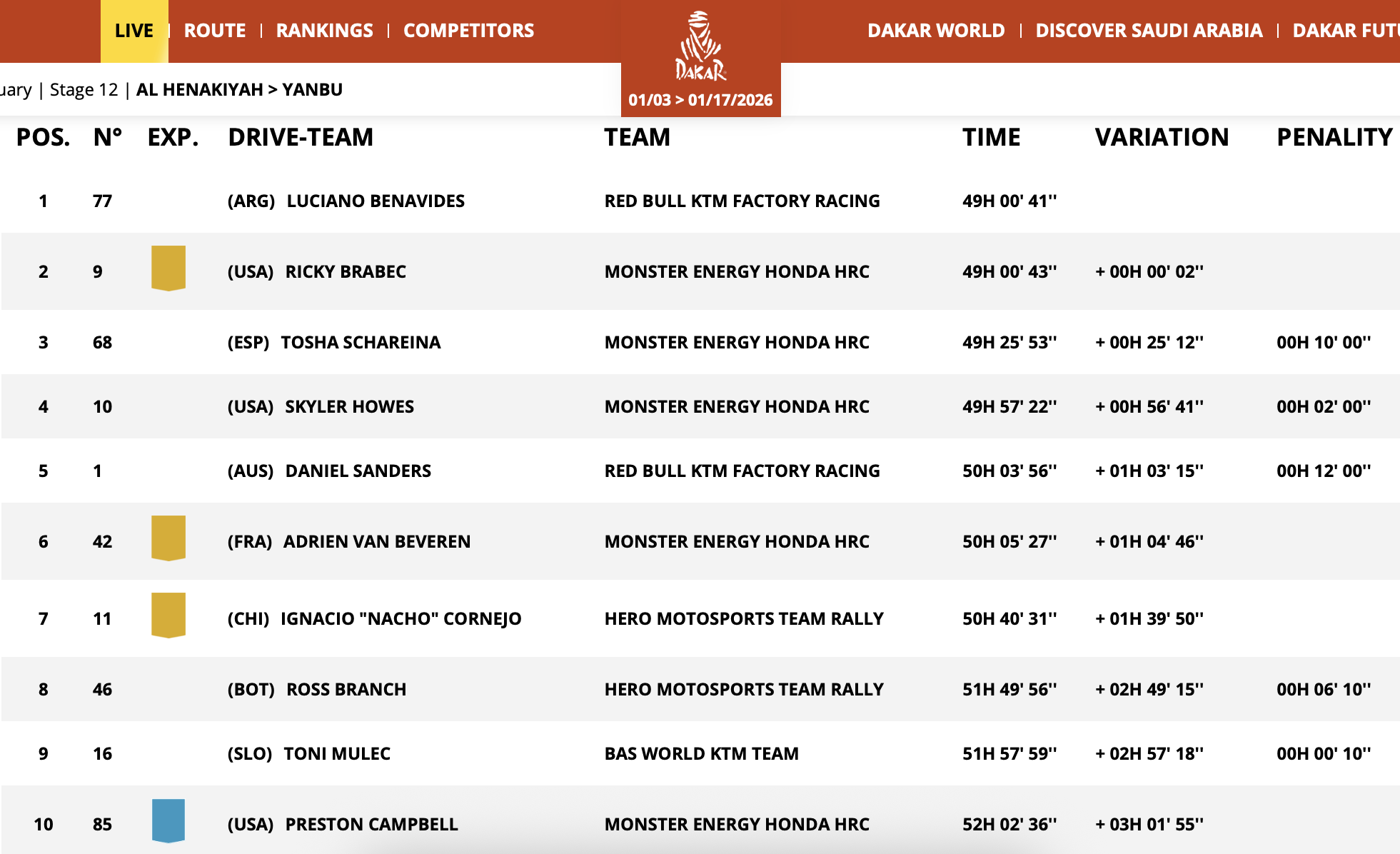 Drama no deserto: Mais cedo, Ricky Brabec parecia ter se perdido enquanto abria o caminho no final do especial. Assim, a classificação provisória faria do argentino Luciano Benavides o vencedor do Dakar de 2026 por apenas 2 segundos sobre o americano, aguardando a confirmação dos resultados (que acabou de ser confirmado).