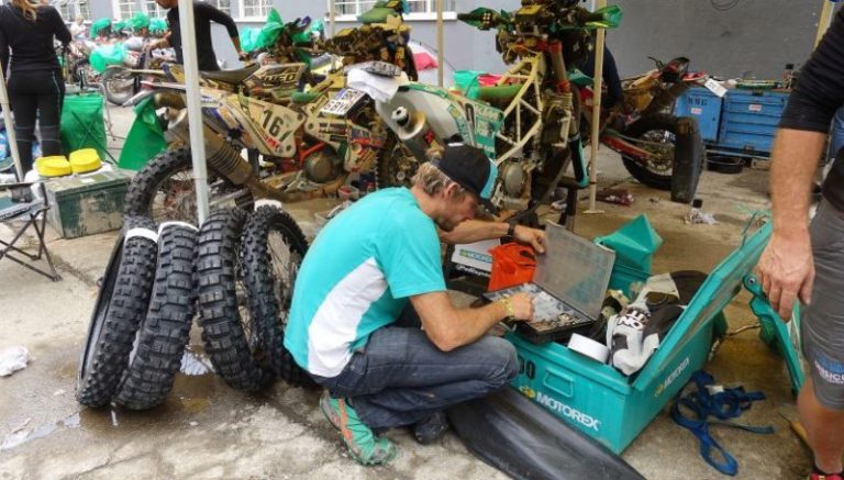É esgotante com o apoio de uma estrutura, mas pelo menos têm-se algumas regalias, desde massagista, a grandes condições no “bivouac” e alguém na equipe a assegurar que está tudo bem com a moto…mas na Malle Moto não há nada. Não há assistência, nem uma equipe de apoio. É apenas o piloto, a moto e uma caixa de metal com as peças indispensáveis para as reparações da moto. Funcionários da organização carregam a dita caixa de metal para cada acampamento e é nessa mala que está a oficina do piloto. E…é só isso.