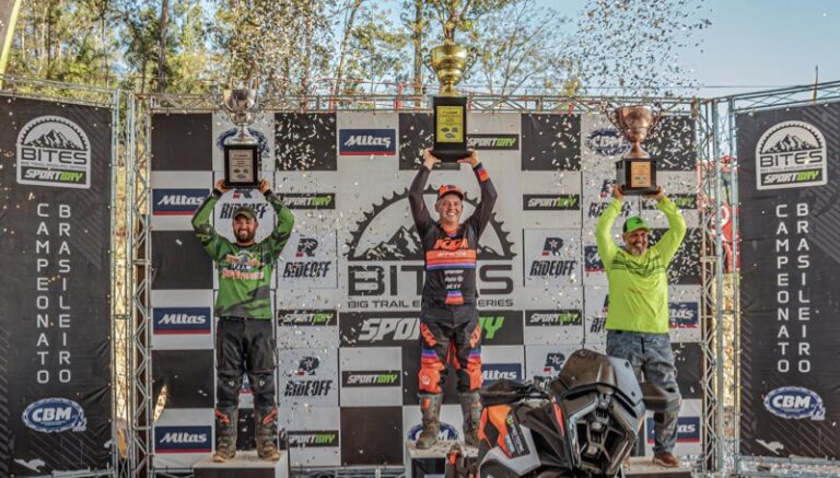 Bicampeão! Marlon Bonilha e a Pro Tork / KTM Sportbay fizeram a festa na grande final do Campeonato Brasileiro de Big Trail 2024, o BITES, que aconteceu neste fim de semana, 28 e 29 de setembro, na cidade de Siqueira Campos, localizada no Norte Pioneiro do Paraná. Correndo em casa, o piloto confirmou o favoritismo na categoria Heavy Pro, fechando o ano com vitória e com as mãos na taça.