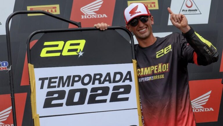 A nona e penúltima etapa do SuperBike Brasil, finalizada neste domingo (20/11), no Autódromo Ayrton Senna, em Goiânia (GO), foi repleta de emoções e conquistas. O piloto Honda Pedro Sampaio faturou antecipadamente o bicampeonato da SuperBike Pro, a principal categoria, com a moto CBR 1000RR-R Fireblade SP. É o décimo título da Honda na competição. Pela Honda Jr Cup, Léo Marques é o novo campeão da classe para crianças e adolescentes com a CG 160 Titan. Na Copa Pro Honda CBR 650R, João Carneiro, que já havia confirmado o segundo título, venceu mais uma prova na temporada.