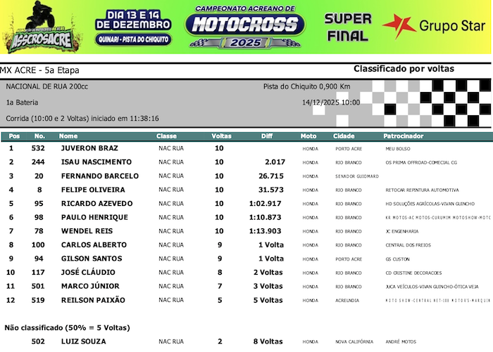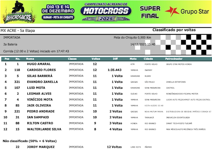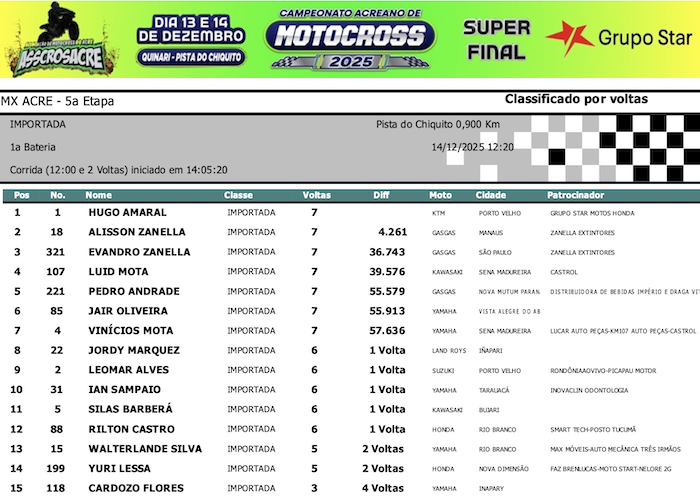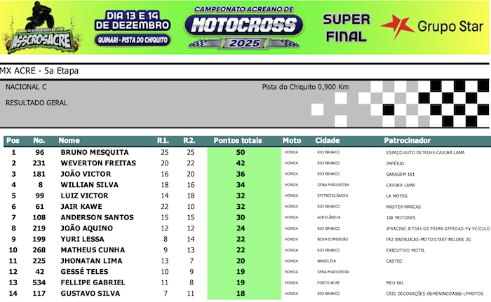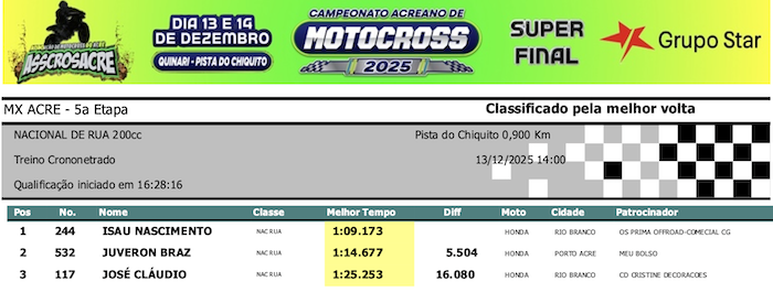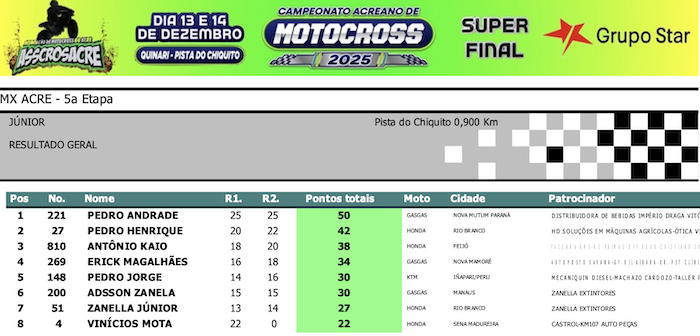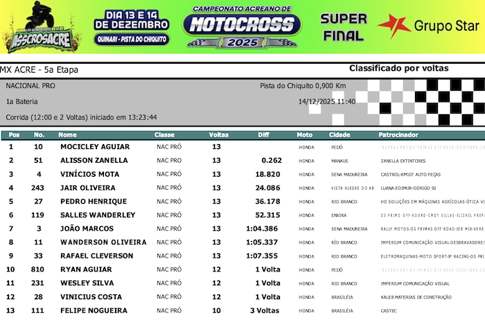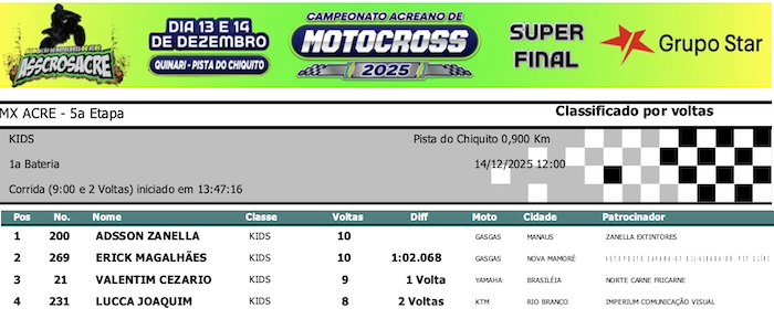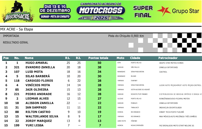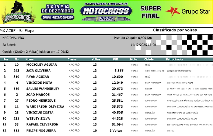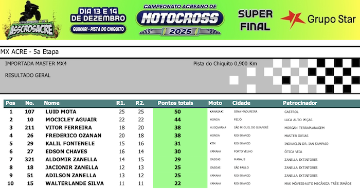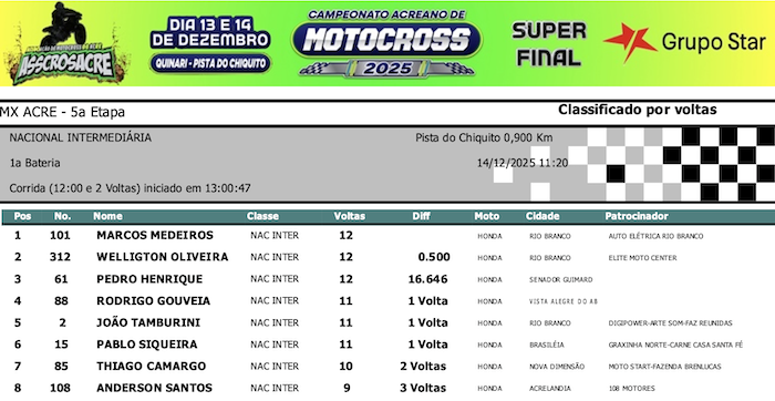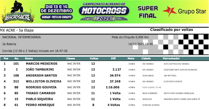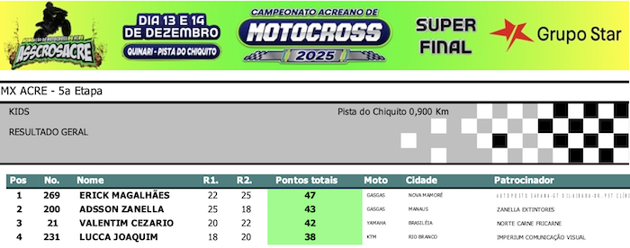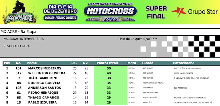 RESULTADOS: ACREANO DE MOTOCROSS – 5ª Etapa – Senador Guiomard