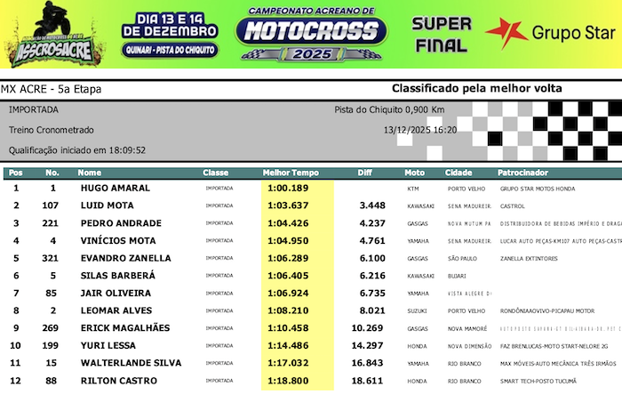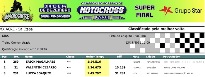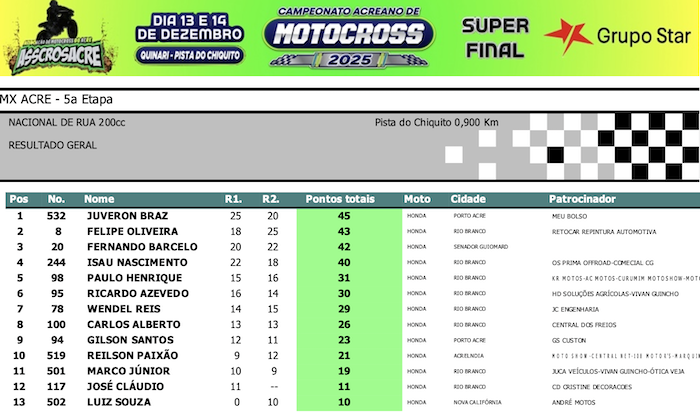 O campeonato acreano de motocross encerrou a temporada 2025 em grande estilo neste fim de semana na cidade de Senador Guiomard. A pista do Chiquito foi novamente o palco de grandes disputas, que contou com a presença dos pilotos da casa e também do Amazonas, Rondônia e do país vizinho Perú.