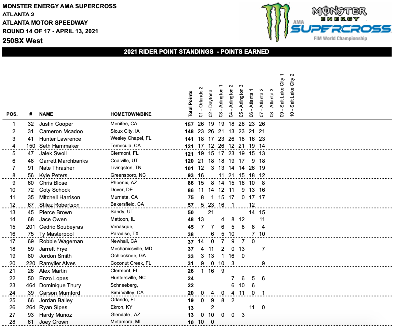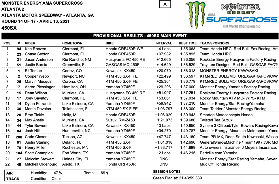 RESULTADOS: AMA SUPERCROSS – 14ª Etapa – Atlanta