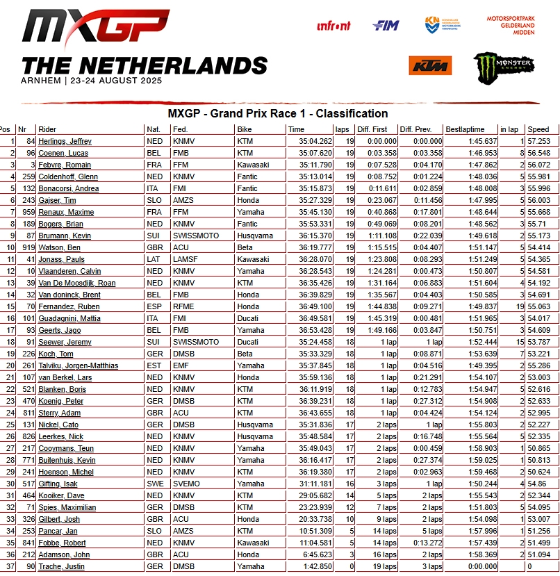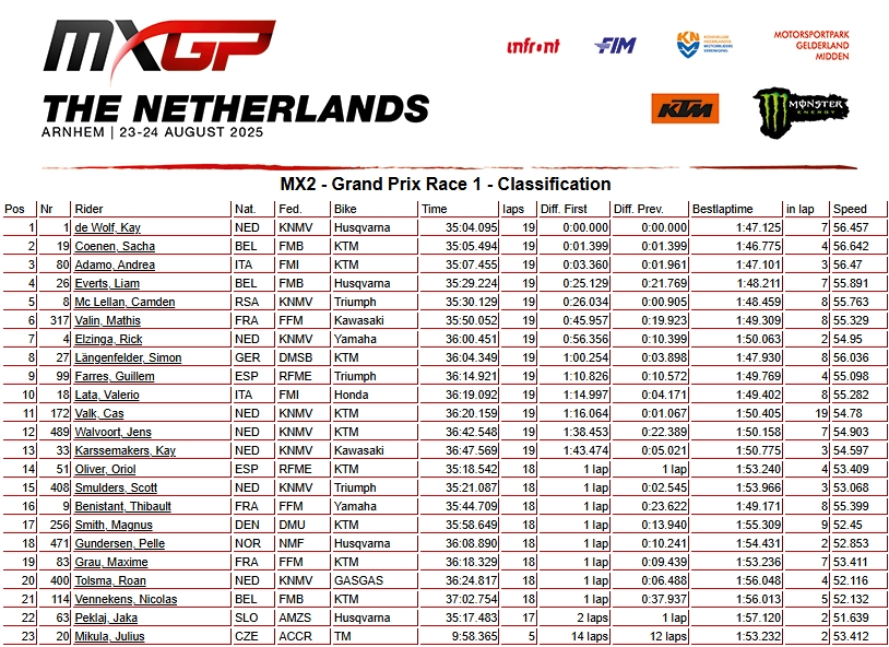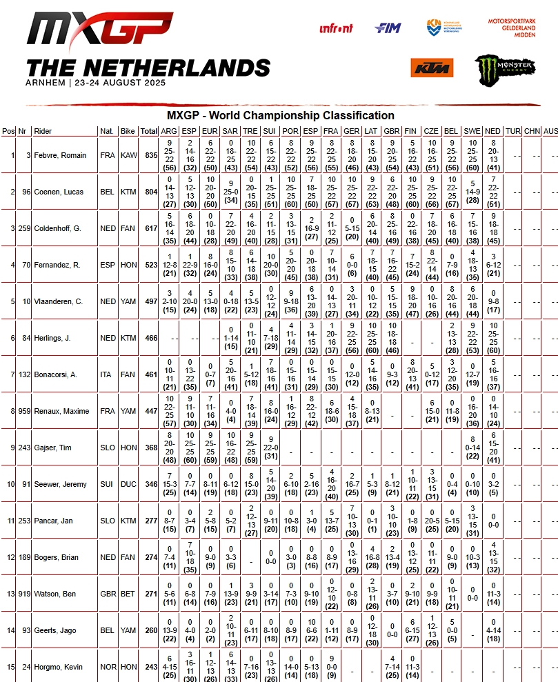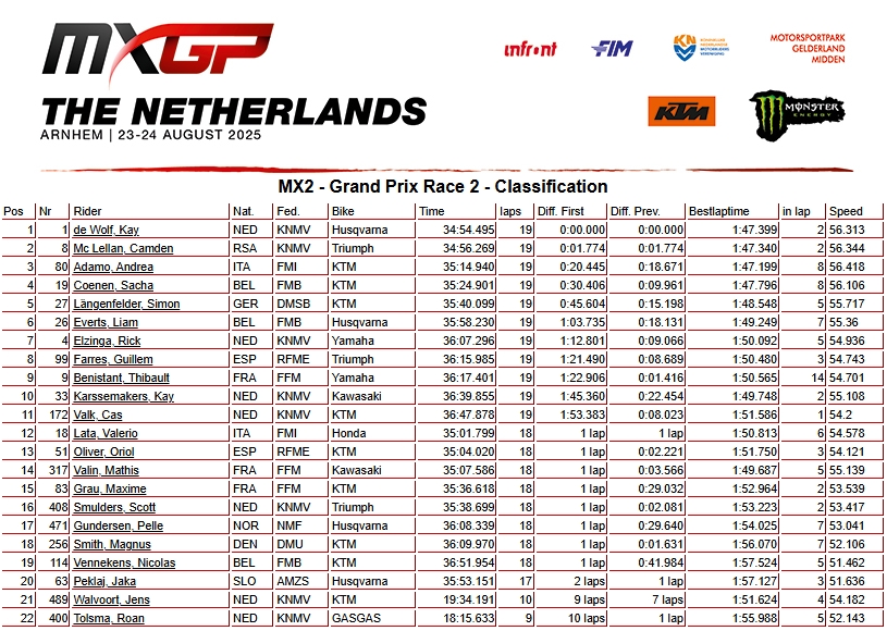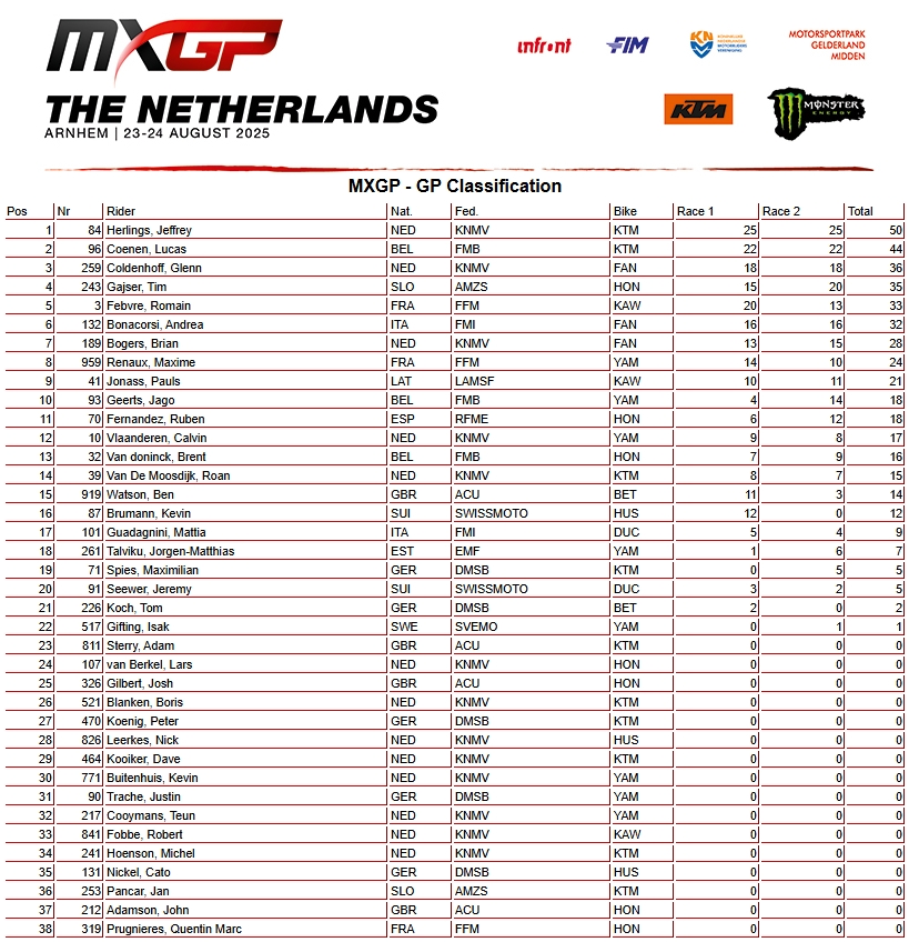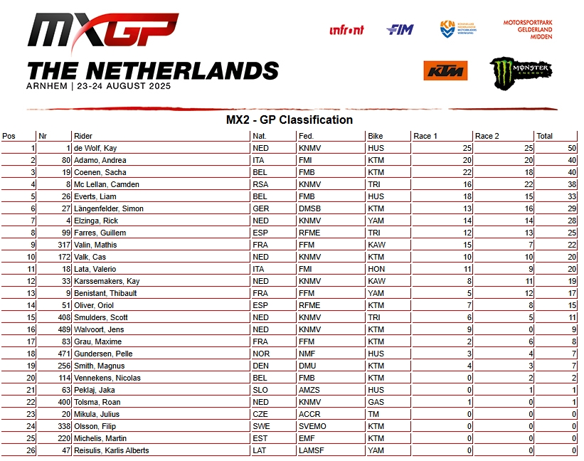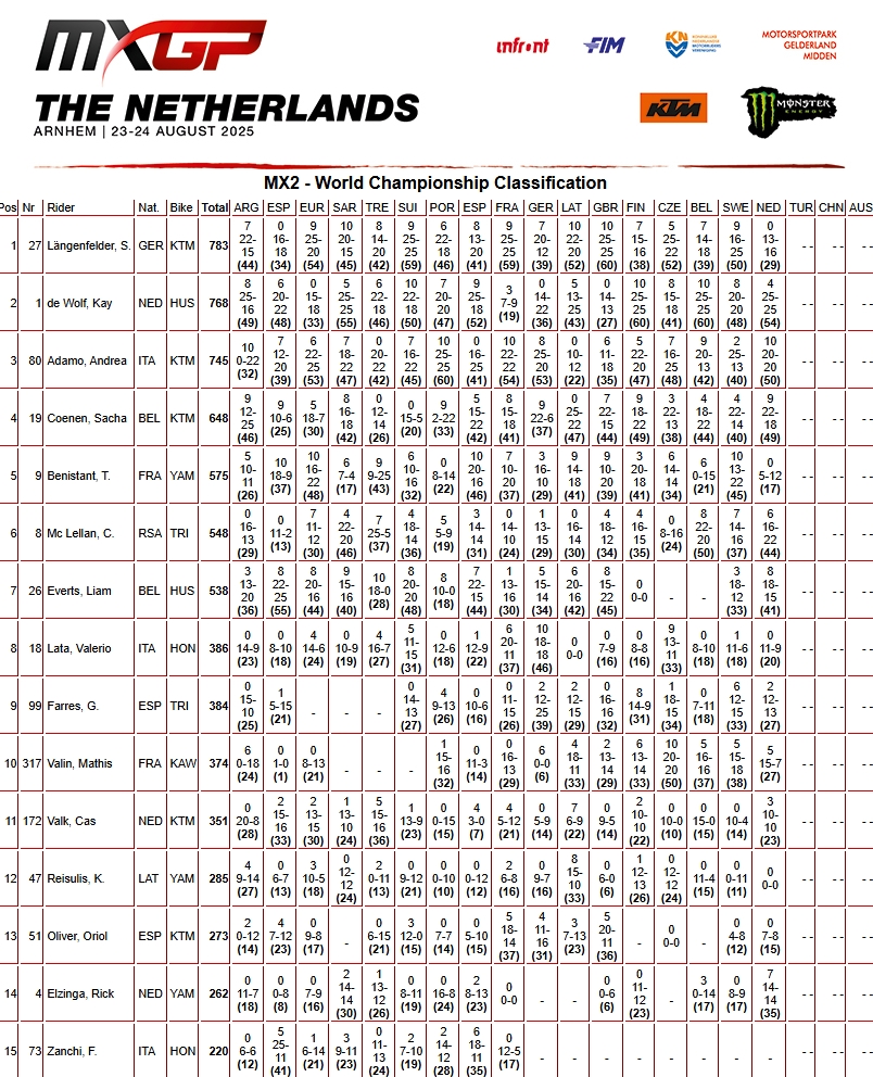RESULTADOS: MUNDIAL DE MOTOCROSS – 17ª etapa – Holanda
