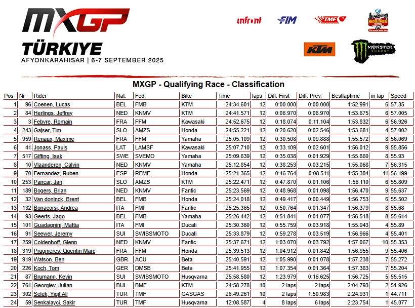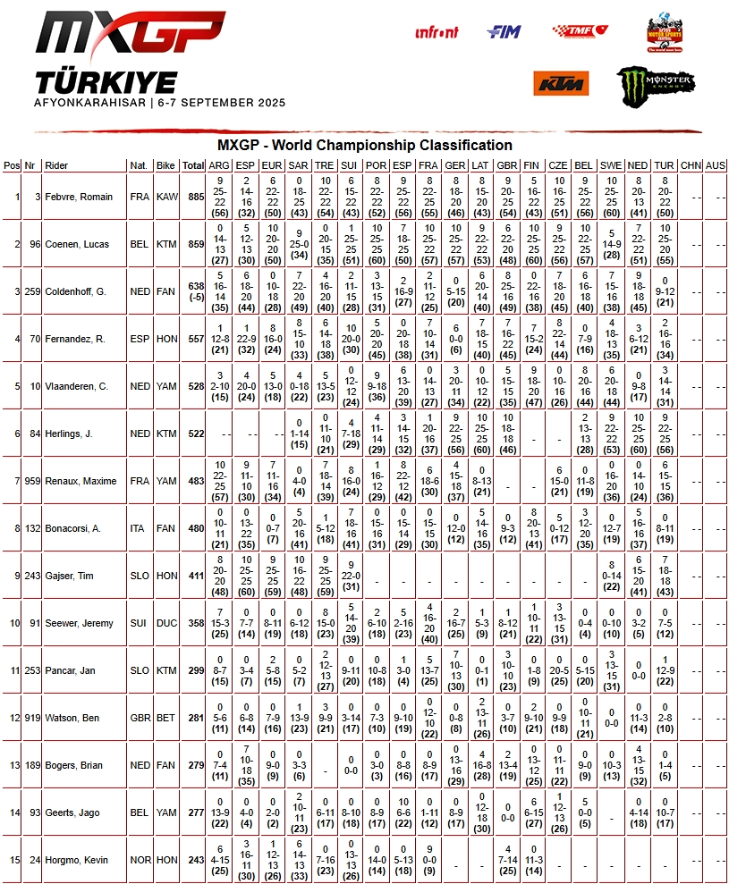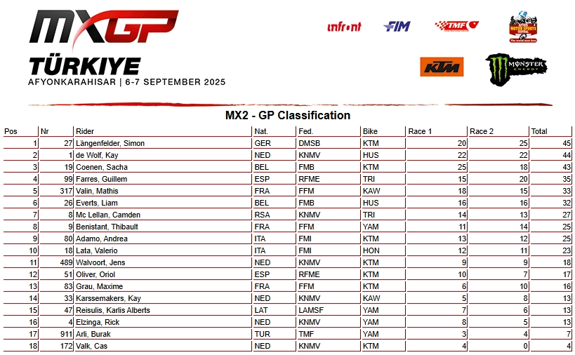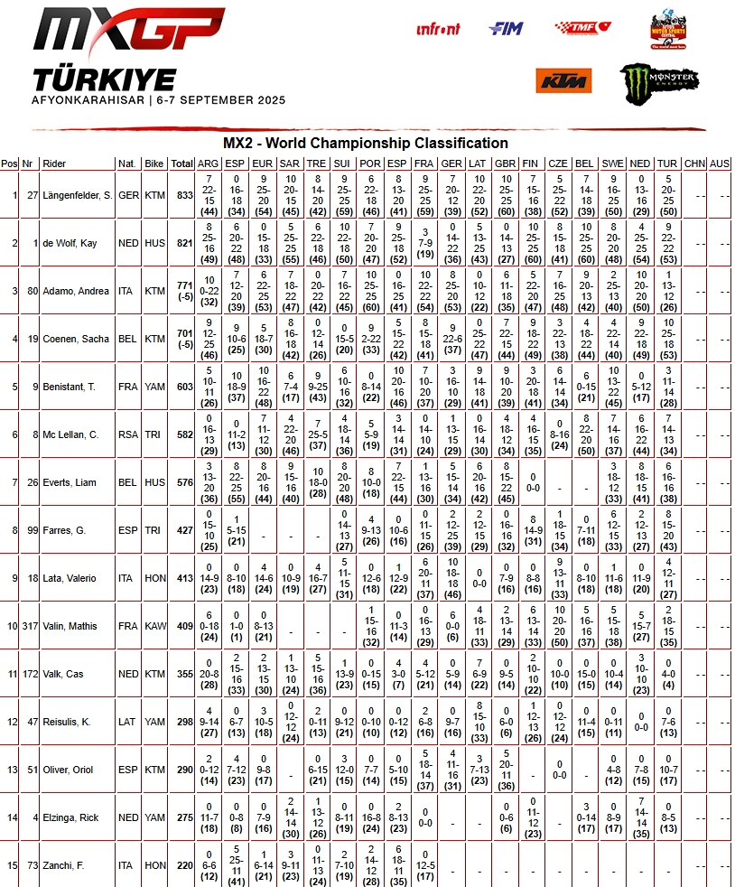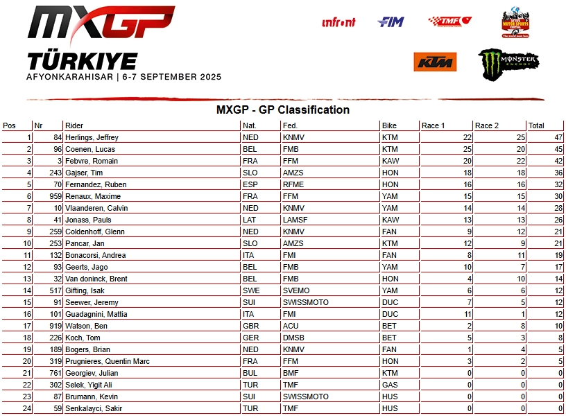 RESULTADOS: MUNDIAL DE MOTOCROSS – 18ª etapa – Turquia