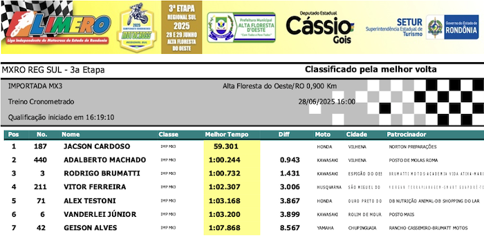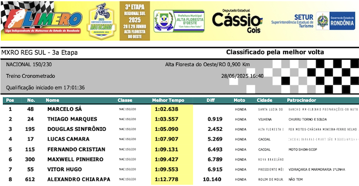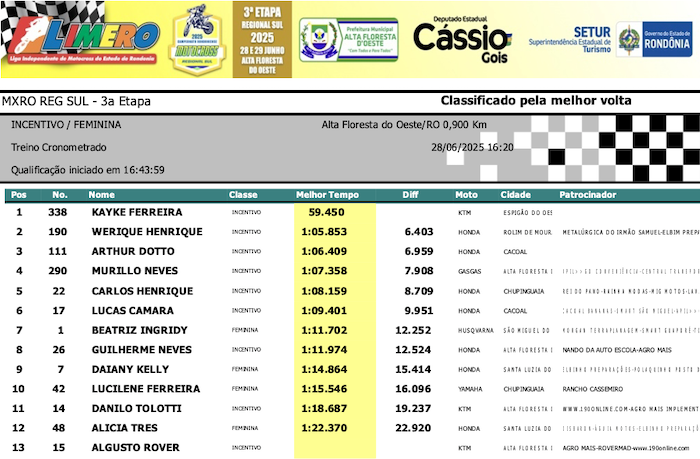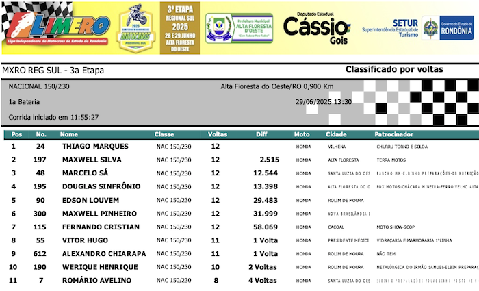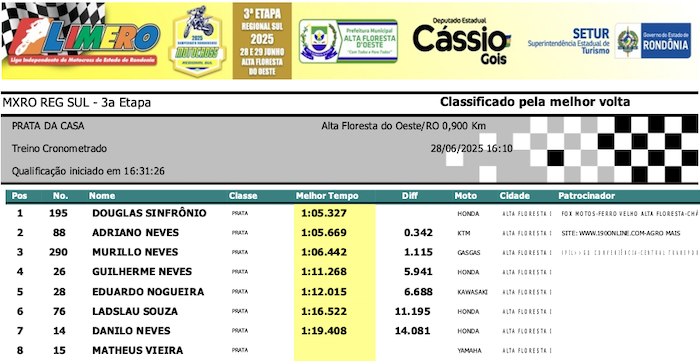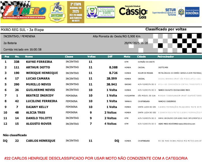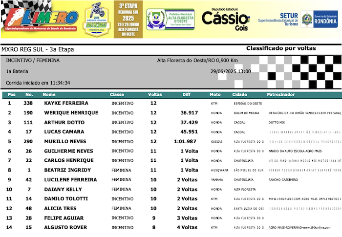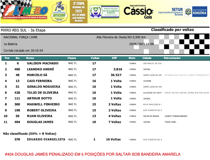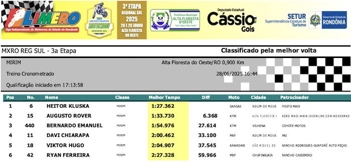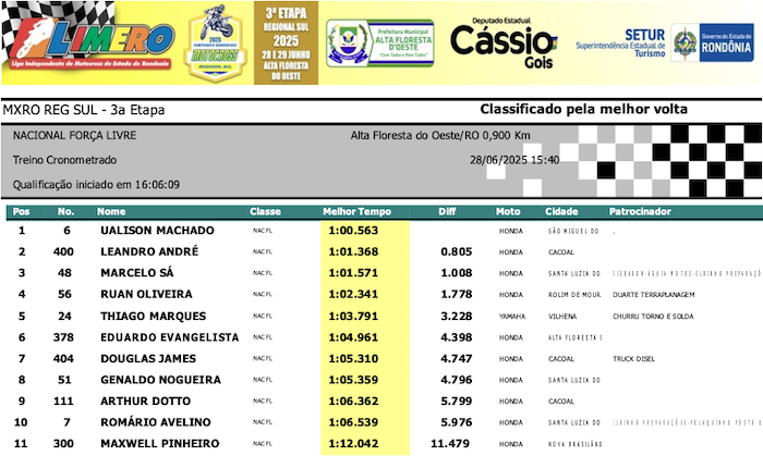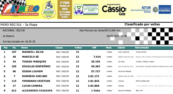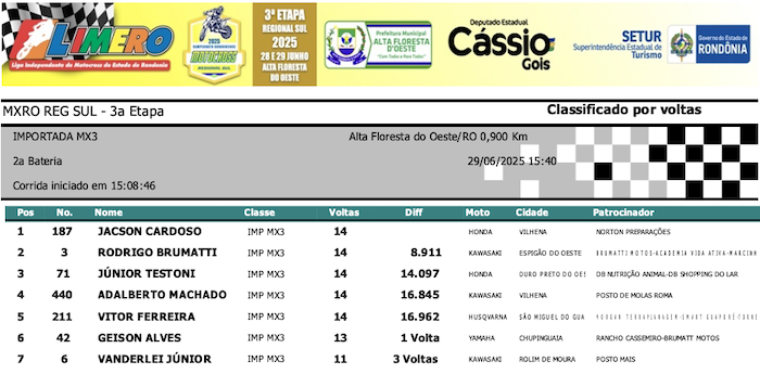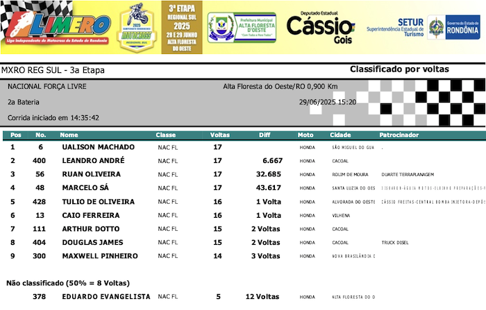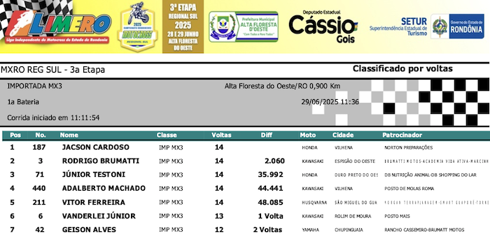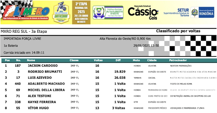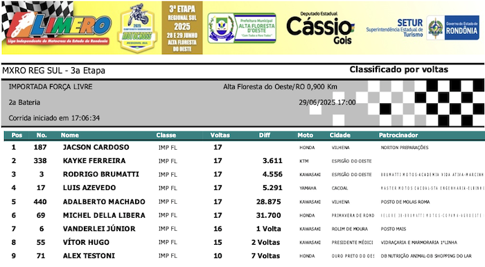 MOTOCROSS RESULTADOS: MX RONDÔNIA REGIONAL SUL – 3ª Etapa – Alta Floresta do Oeste 30/06/20251235 visualizações Foto: @vaiouracha35 LEIA MAIS: Husqvarna PowerHusky/ Itaminas é Campeã Brasileira de Motocross na 50cc com Pietro Fraga