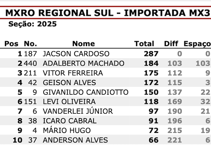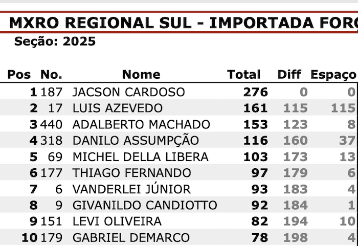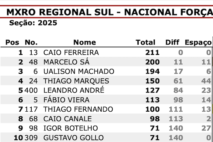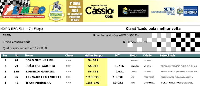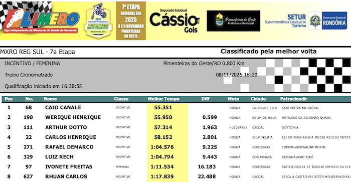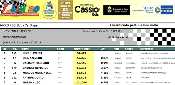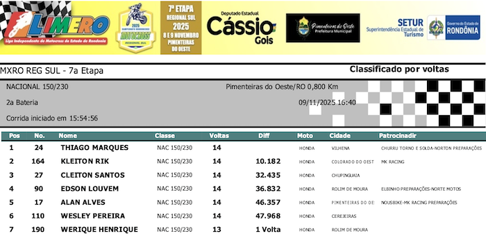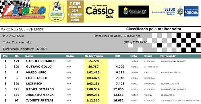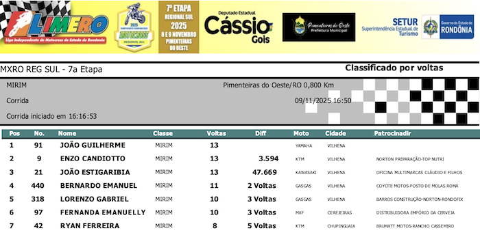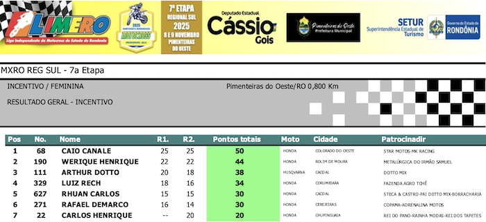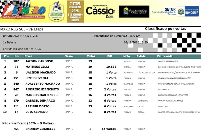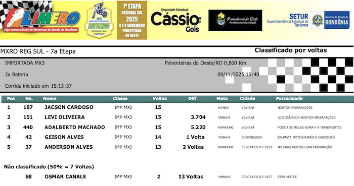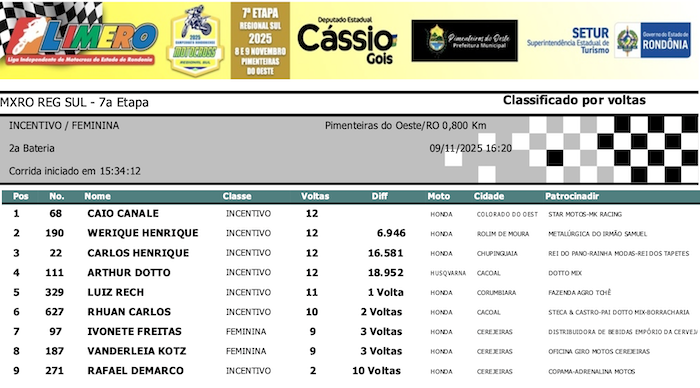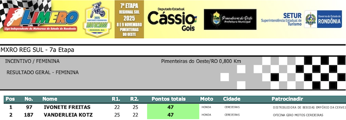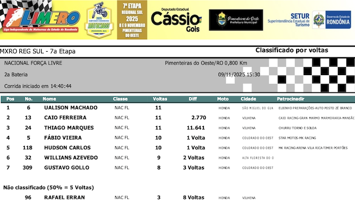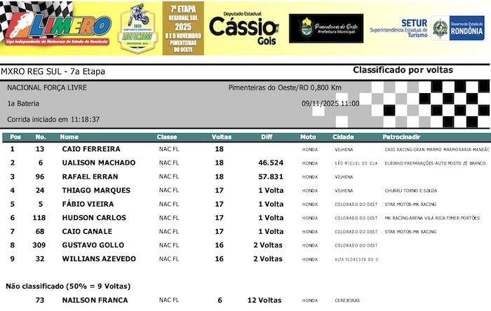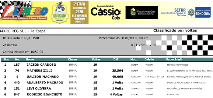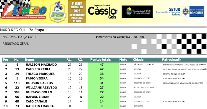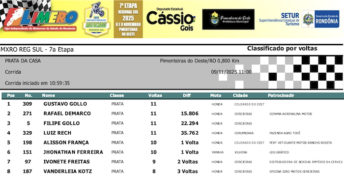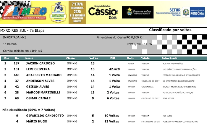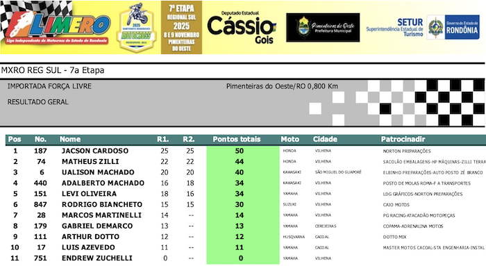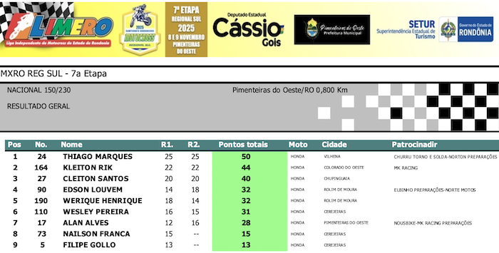 MOTOCROSS RESULTADOS: Rondoniense de Motocross Regional Sul – 7ª Etapa – Pimenteiras do Oeste 10/11/2025810 visualizações Foto: @vaiouracha35 LEIA MAIS: Cole Seely fora do AMA Motocross