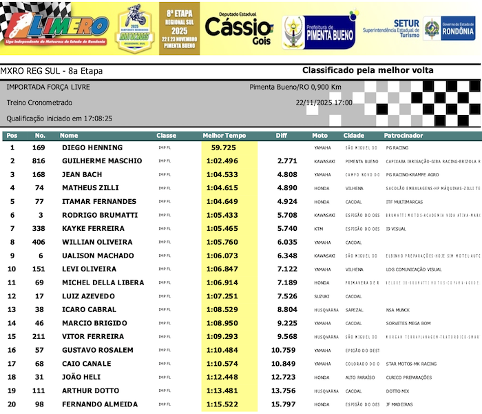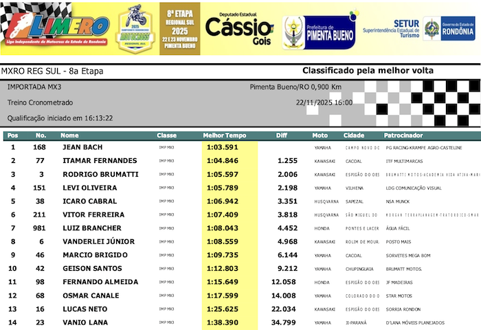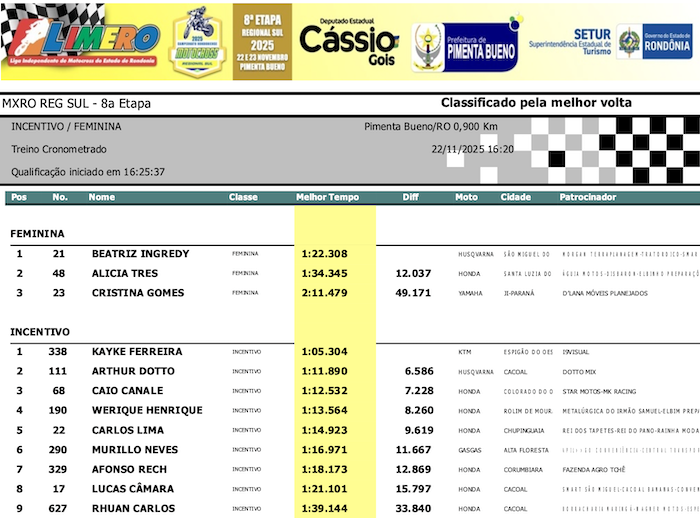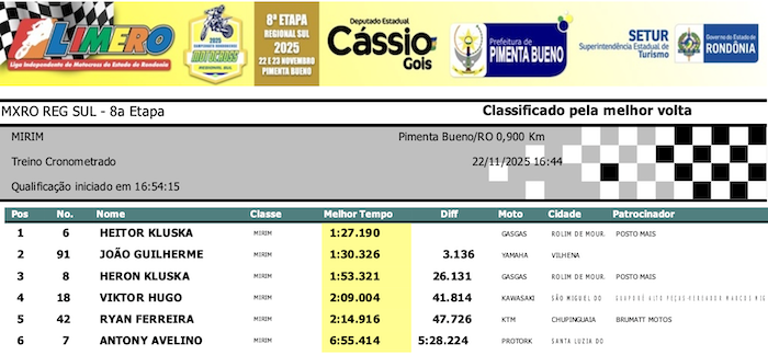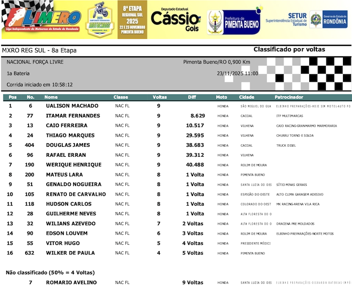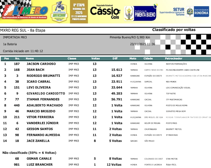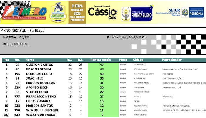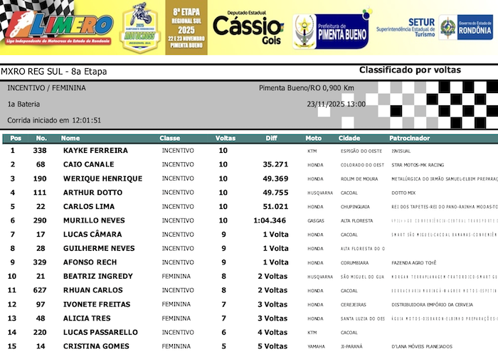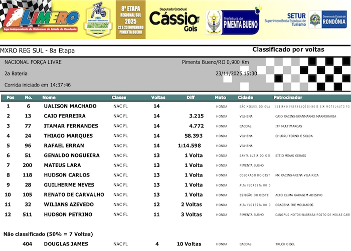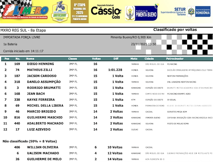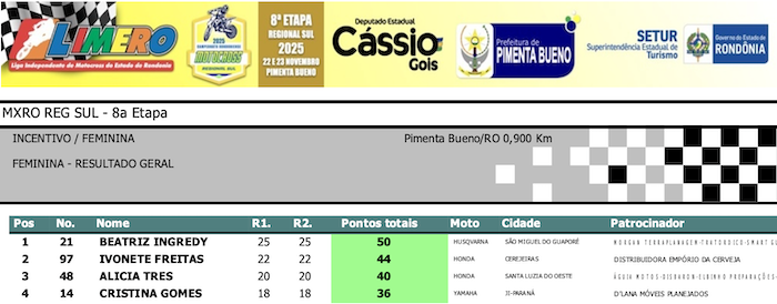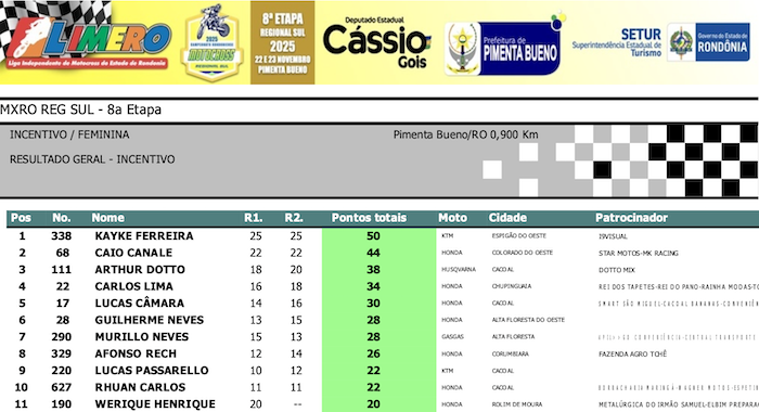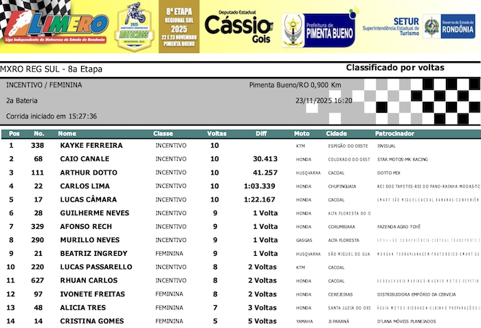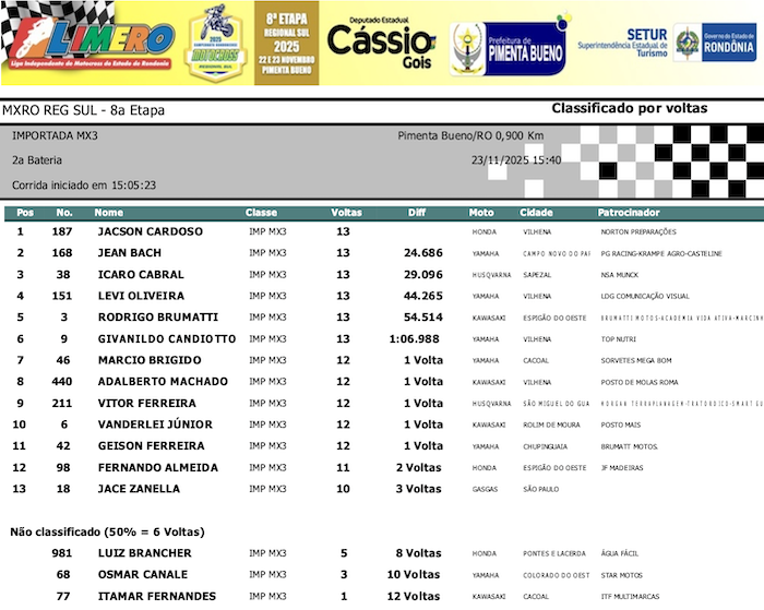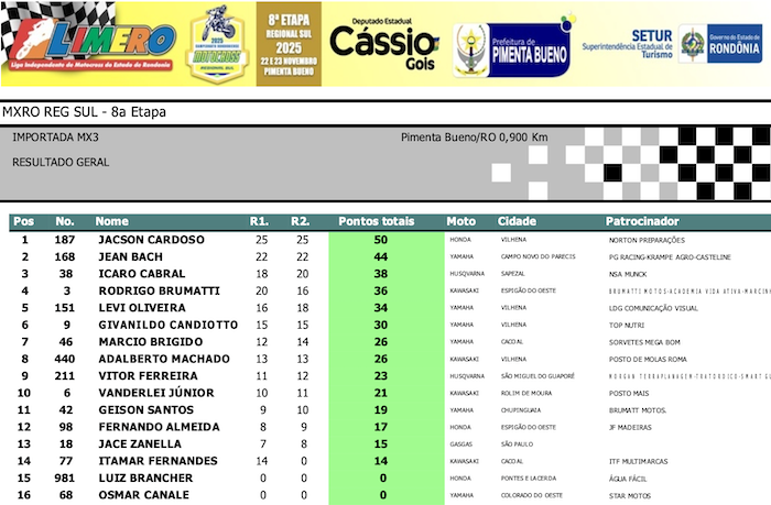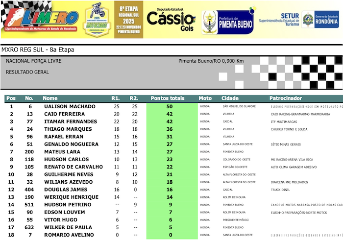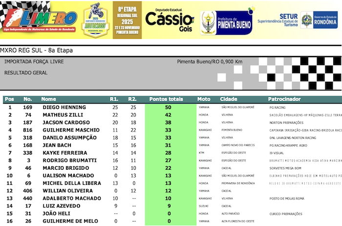 RESULTADOS: Rondoniense de Motocross Regional Sul – 8ª Etapa – Pimenta Bueno