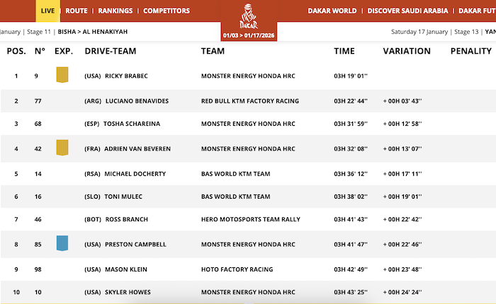 O americano também assumiu a liderança no ranking geral, com uma vantagem de 3’20” sobre Benavides, tendo começado o dia 23 segundos abaixo do argentino. Com 105 quilômetros contra o relógio a serem cobertos amanhã, a menos que o infortúnio atinja, Brabec parece bem preparado para adicionar um terceiro título aos dois ganhos em 2020 e 2024.