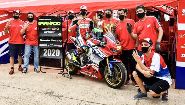 Após vencer a corrida da sétima e penúltima etapa, neste domingo (6/12), o piloto Eric Granado se tornou o primeiro tetracampeão da história da categoria SuperBike Pro no SuperBike Brasil – considerado a principal competição de motovelocidade do país. Pedro Sampaio garantiu o vice-campeonato. Desta forma, a Honda Racing alcançou dobradinha com as motocicletas CBR 1000RR Fireblade SP na pista do Autódromo de Potenza, em Lima Duarte (MG). O título de Granado representou o oitavo consecutivo da equipe vermelha na categoria de elite do SuperBike Brasil.