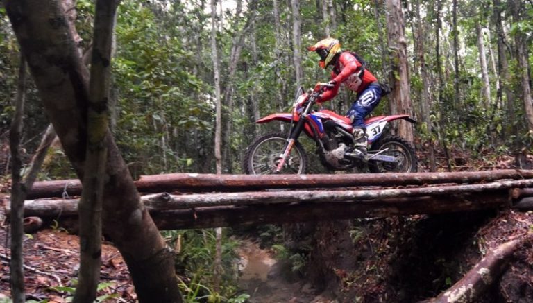 Ele acelera a motocicleta Honda CRF 250F, modelo nacional da Honda.