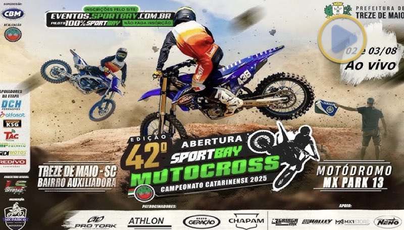 MOTOCROSS VÍDEO: Assista AO VIVO a abertura do catarinense de motocross direto de Treze de Maio 02/08/20251423 visualizações Foto: Reprodução Youtube LEIA MAIS: MXGP: Horários e transmissão AO VIVO do GP da Inglaterra neste domingo