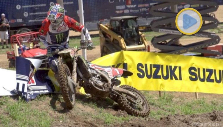 Este é o momento que a moto de Eli Tomac teve problemas quando liderava a primeira bateria em RedBud. O piloto da Kawasaki fez muito esforço para tirar a moto para fora da pista. Tomar perdeu pontos preciosos no campeonato.